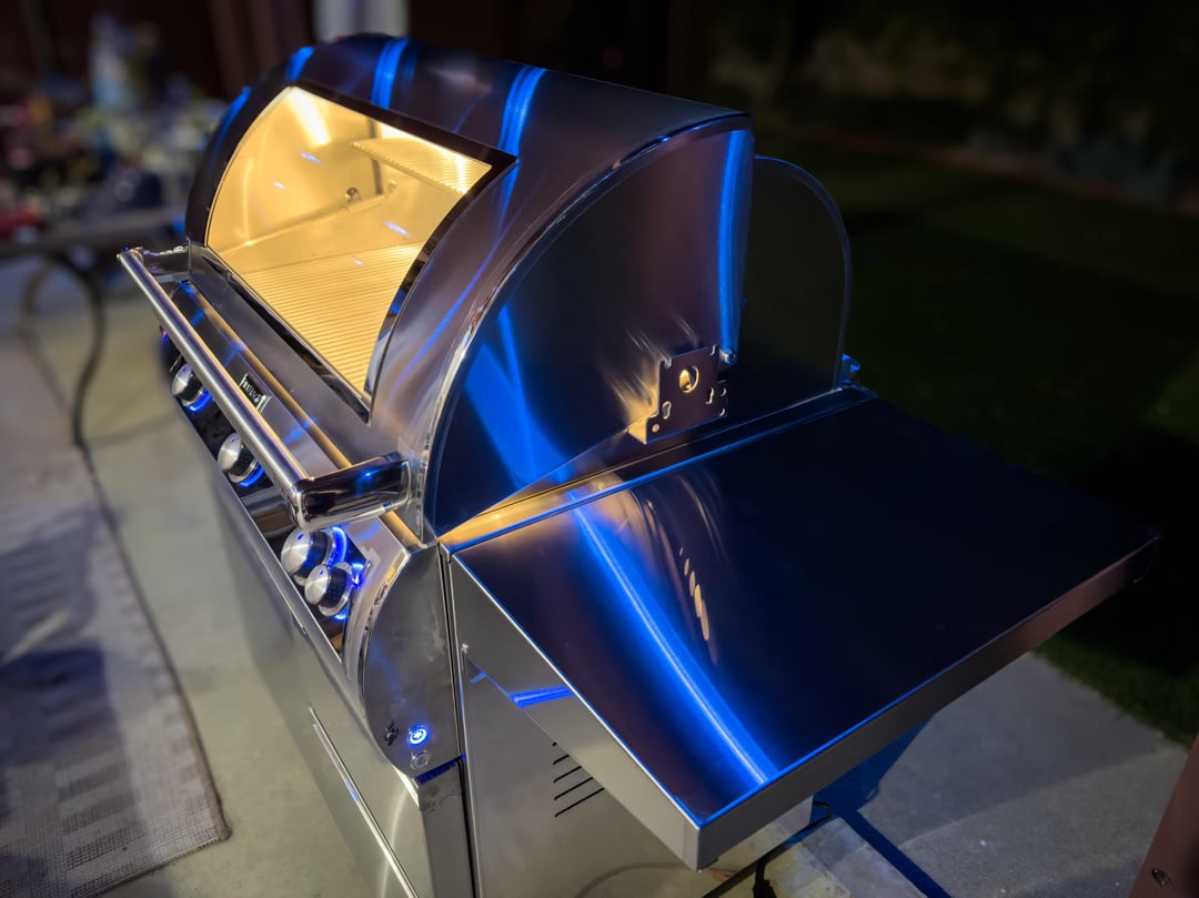 New to this subreddit and I just wanted to share my new grill that I worked hard to design and I finally have one at home! I'm a product engineer for all the FireMagic and American Outdoor Grills at RH Peterson. I designed the new cart and "under glass" face for our newish line of Echelon grills. This unit is the new E790 portable with infrared back burner and Magic View window.