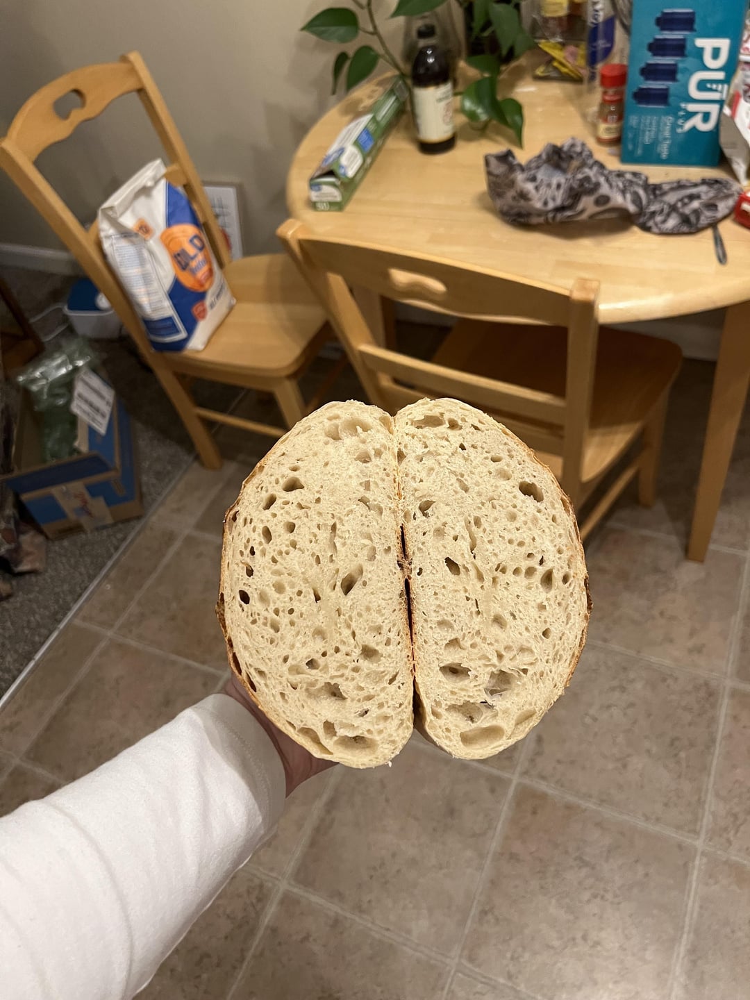 Final shape the loaves, cover and sit another ten mins. One of them I threw in a floury rag bowl to cold proof for 16 hr. The other I scored, threw in my 500 degree preheated dutch oven, baked at 500 for 23 mins covered. I threw some ice cubes outside the parchment but it didnt actually help.. then lowered heat to 450 and had to cook about 28 mins there. Take it out, let it set 30 mins, cut in too early but god I really needed this and I’m so thankful