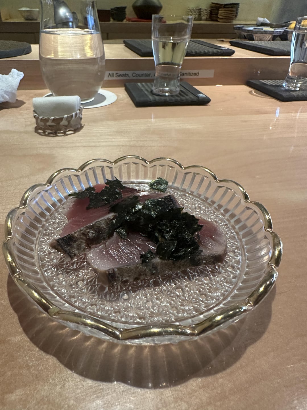 1. Smoked Katsuo (8.5/10 as sashimi and 9/10 as nigiri) very good – love how it all just worked together quite well) (I also got this as nigiri) w cut up nori and mustard