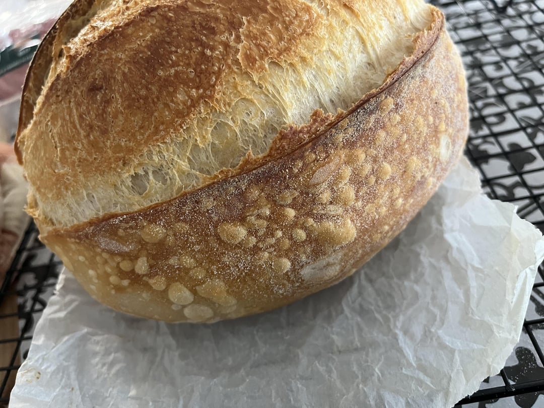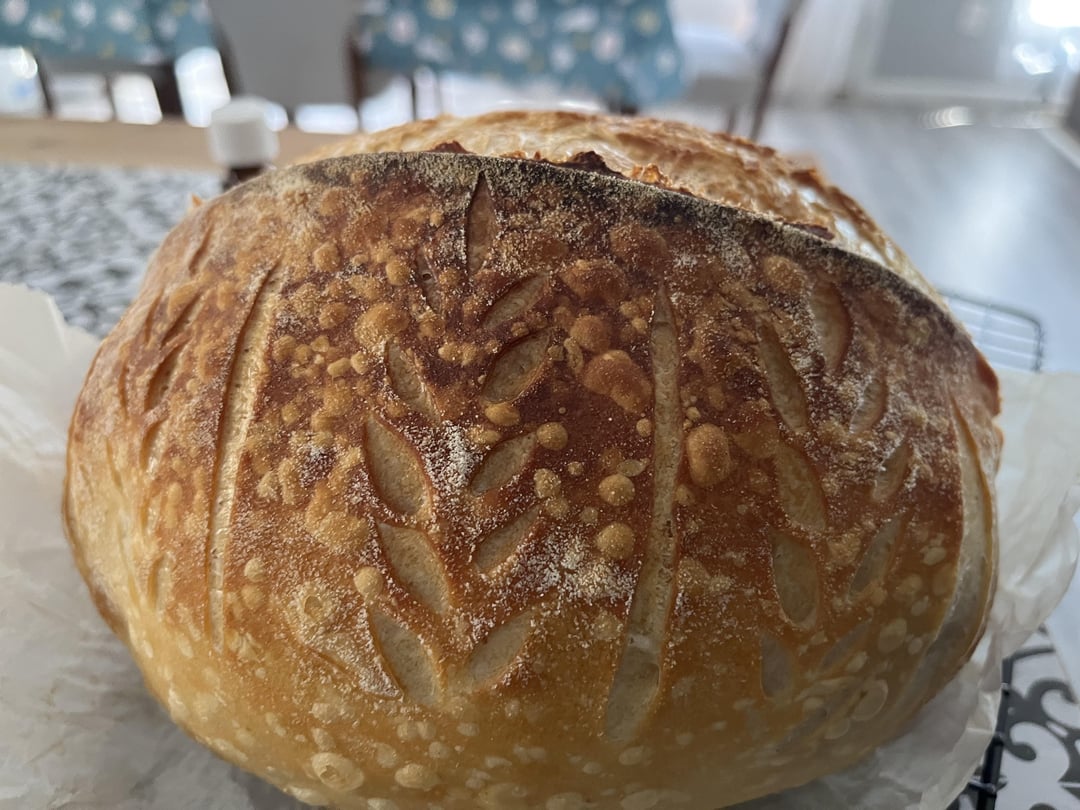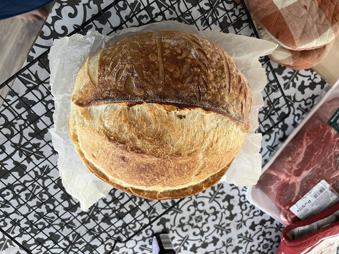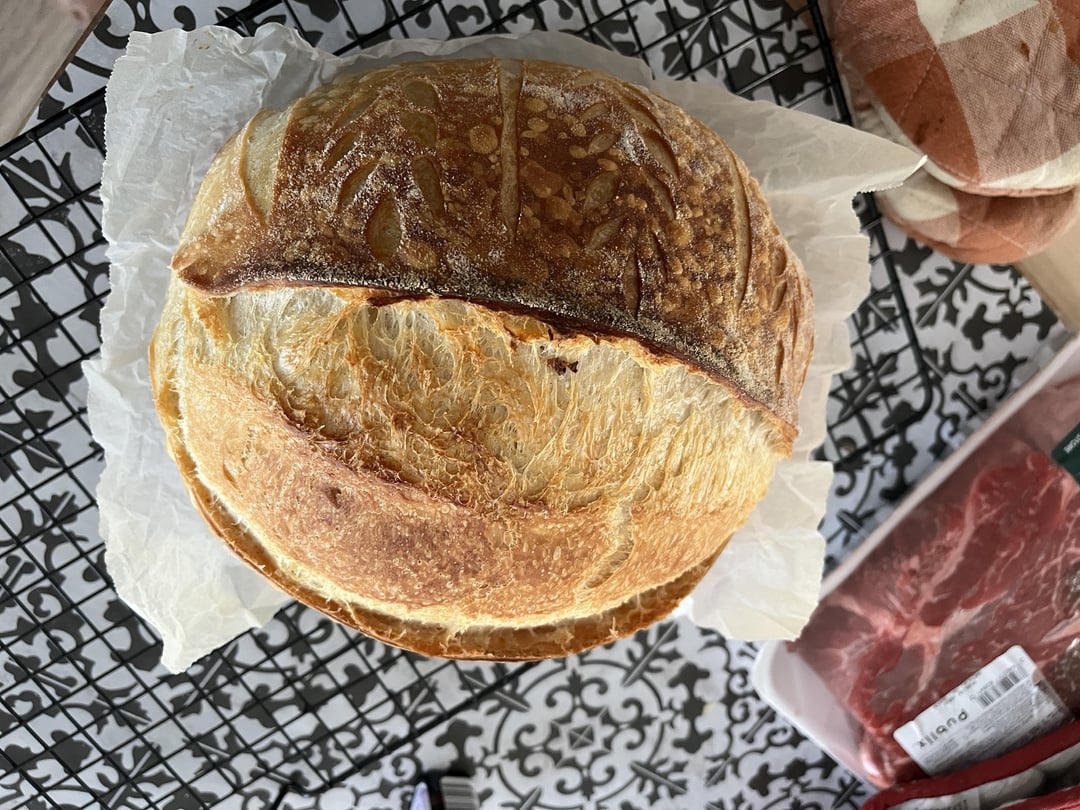 Baked in am at 10:30. Preheated oven to 450 for 30-60 minutes with dutch oven inside. Boiled water to add to bottom of dutch oven to create steam (usually use ice but it doesn’t give enough steam to me). 30 minutes lid on. Dropped temp to 425 for another 20 minutes.