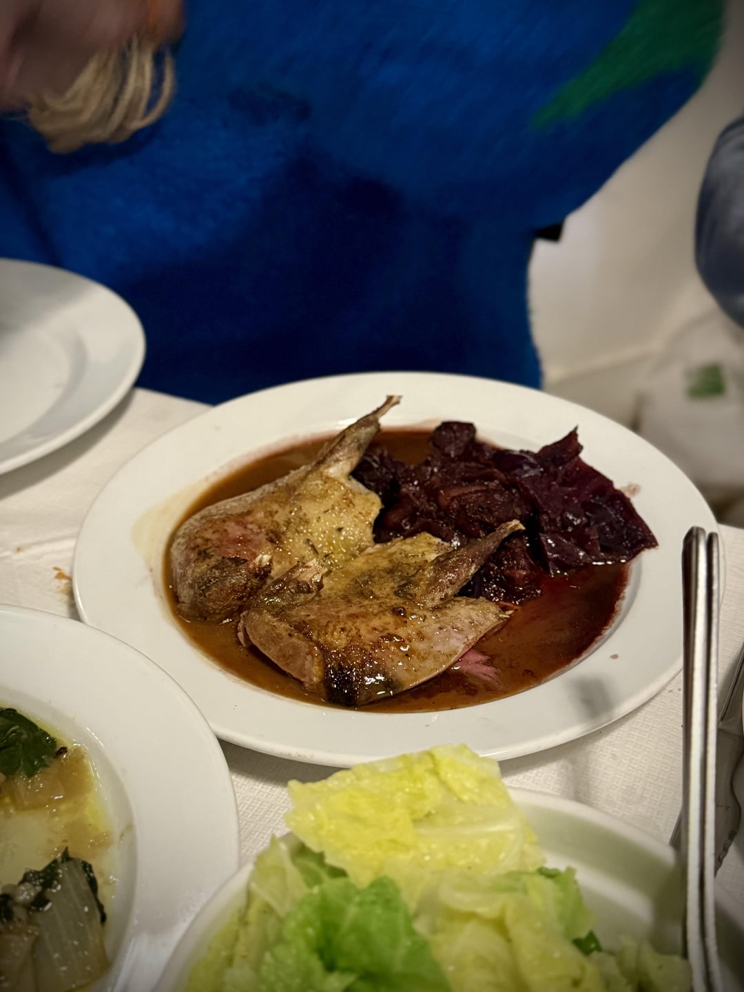 We really don't get much pigeon in America so I was excited to try it. While the flavors were good it was a little tough and a fair amount of effort to get the meat off the bone. The sauce was excellent and the cabbage went together very well.