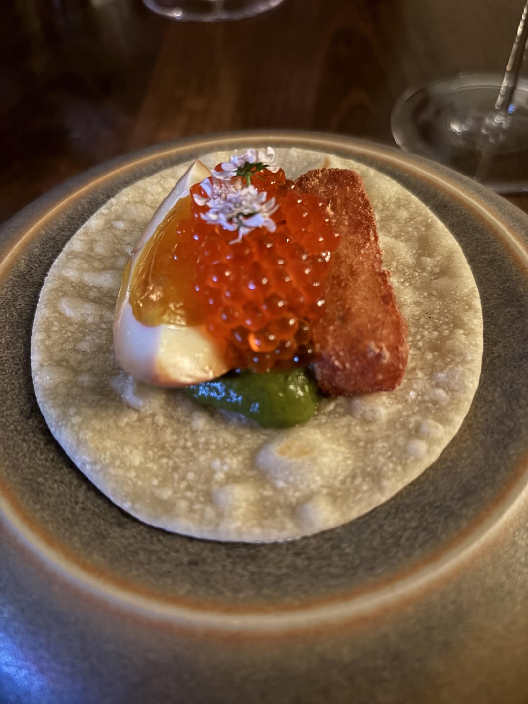 Potentially my favorite course was the first one, the breakfast taco, with aijitama (soy egg), hash browns, and smoked trout roe. Super deep smoky flavor and excellent texture. Messy (the base is a flour tortilla – it really is a taco) but tasty.