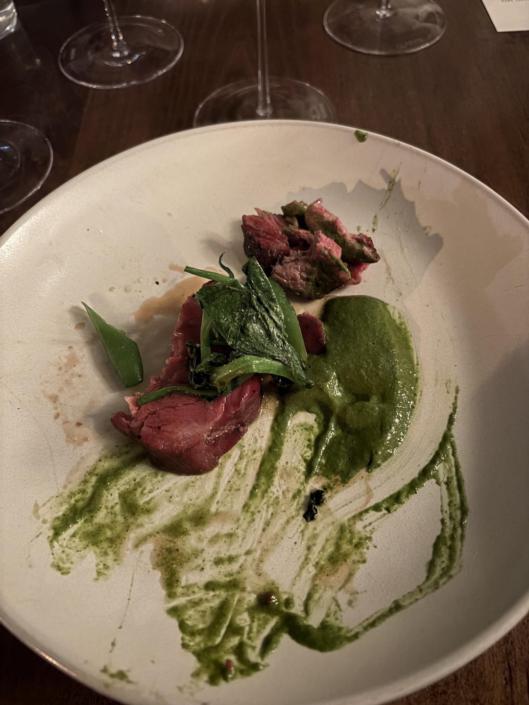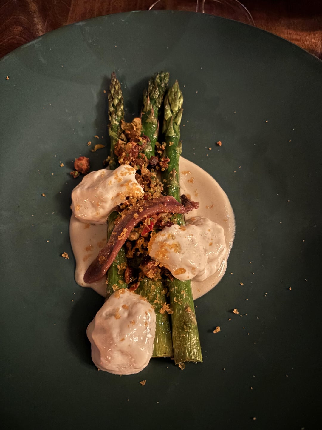 The asparagus was a well-conceived dish with what I think was burrata, honey, and anchovy along with extremely mild asparagus.