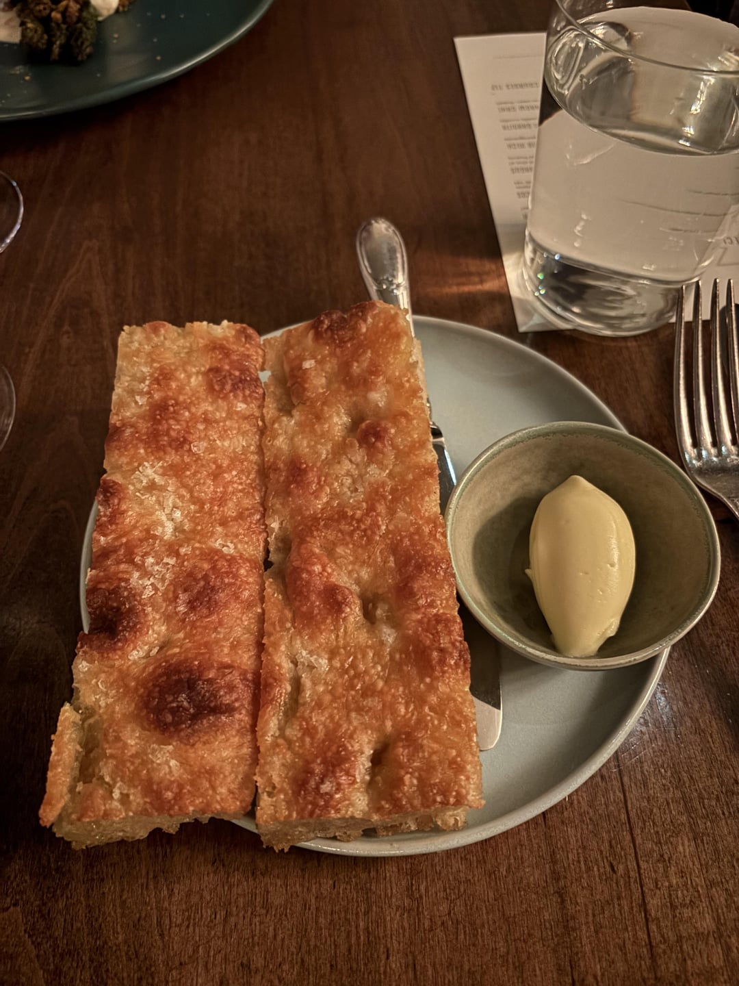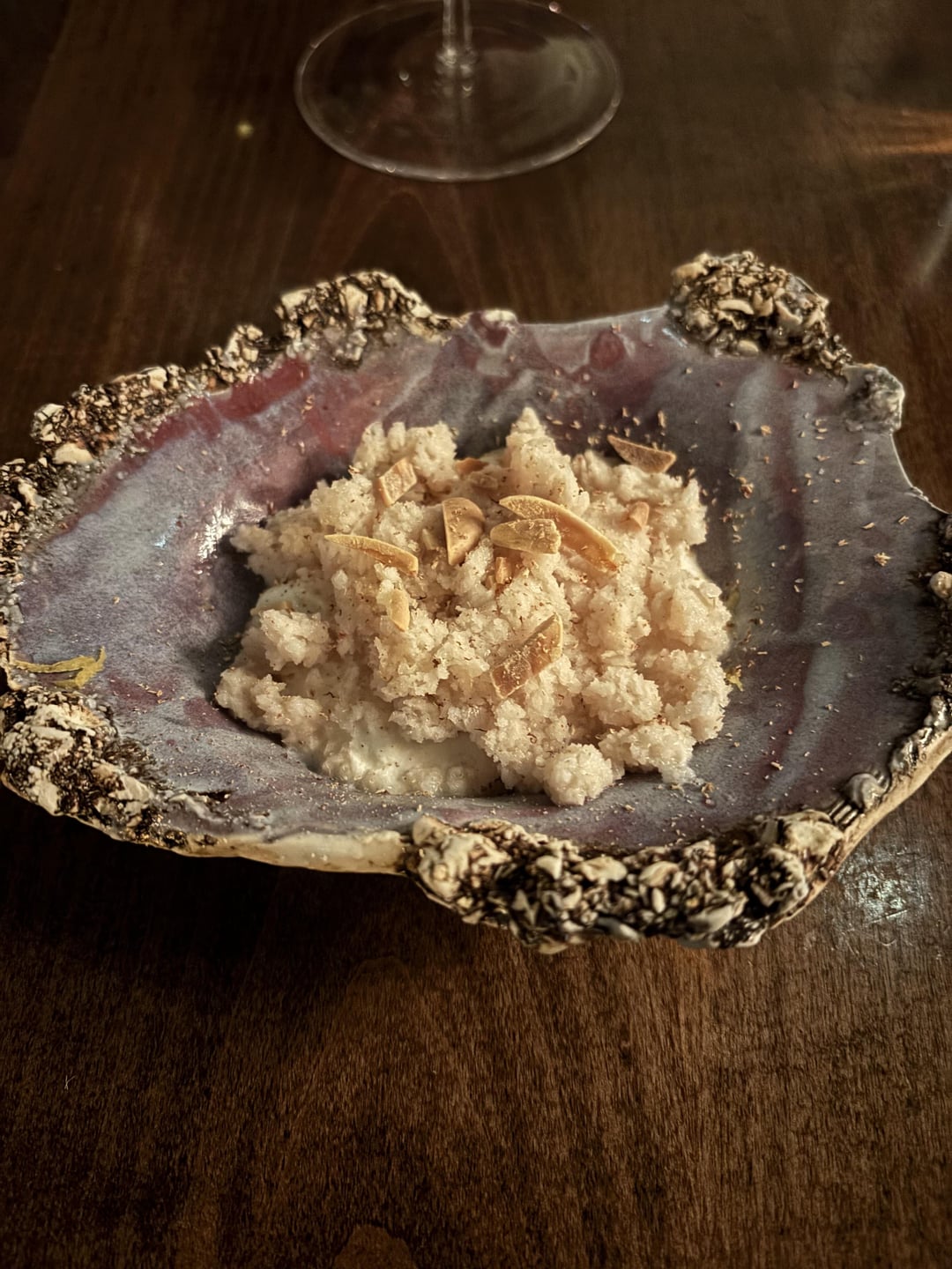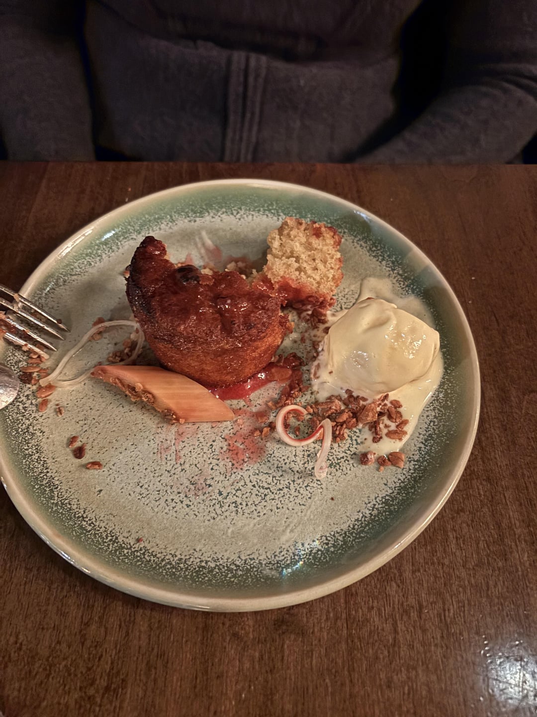 The almond granita as a first dessert was excellent – very refreshing and a good mix of textures. The finale (also partially eaten) was a bone marrow cake. Great texture kind of like a canele and well-executed but I would have liked more punchy flavors.