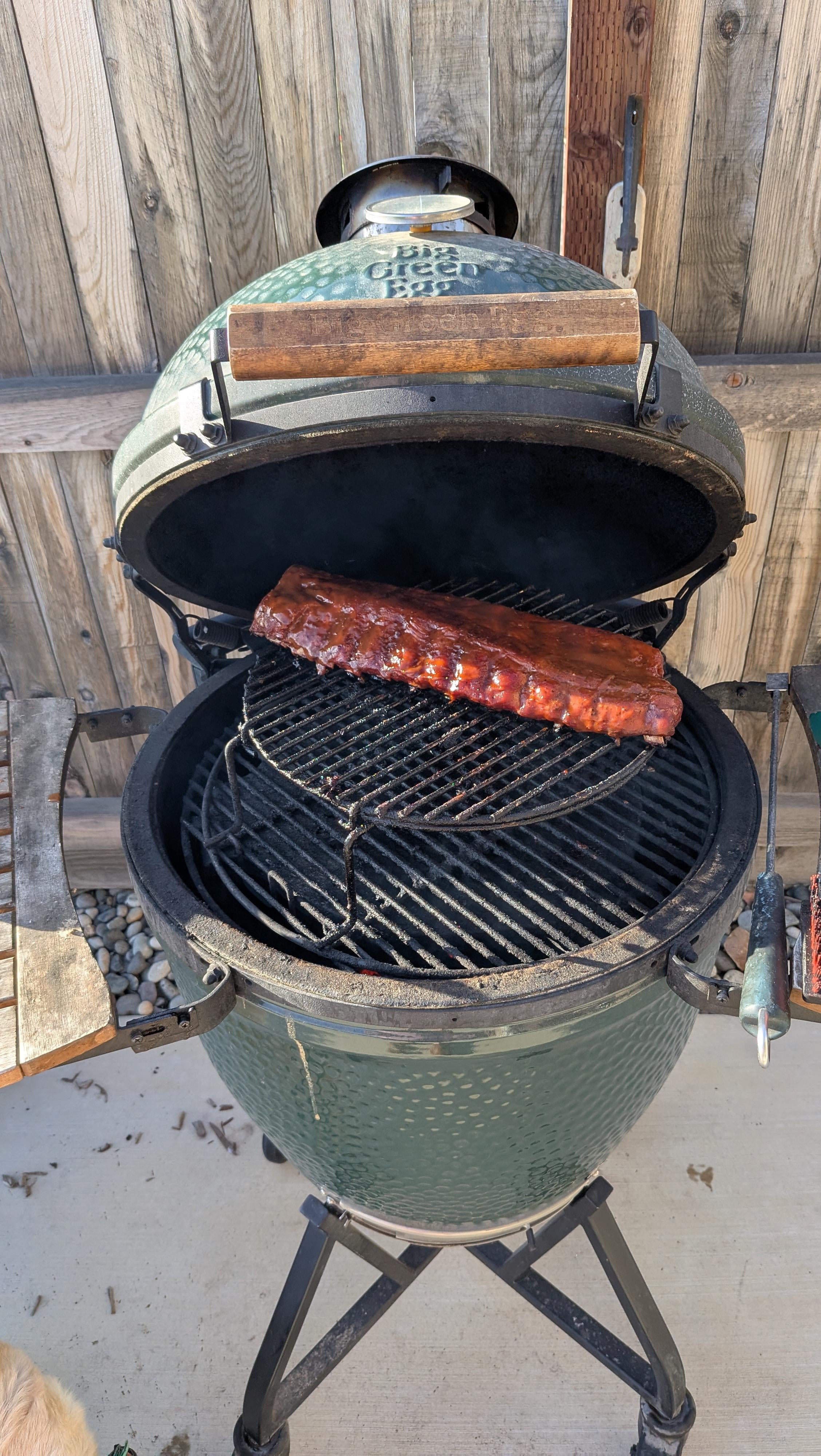 Made some ribs on the egg. 2 uncovered, 1.5 covered and .5 uncovered and sauced.