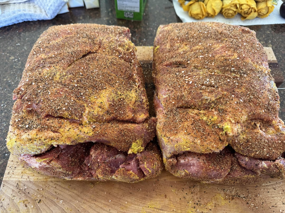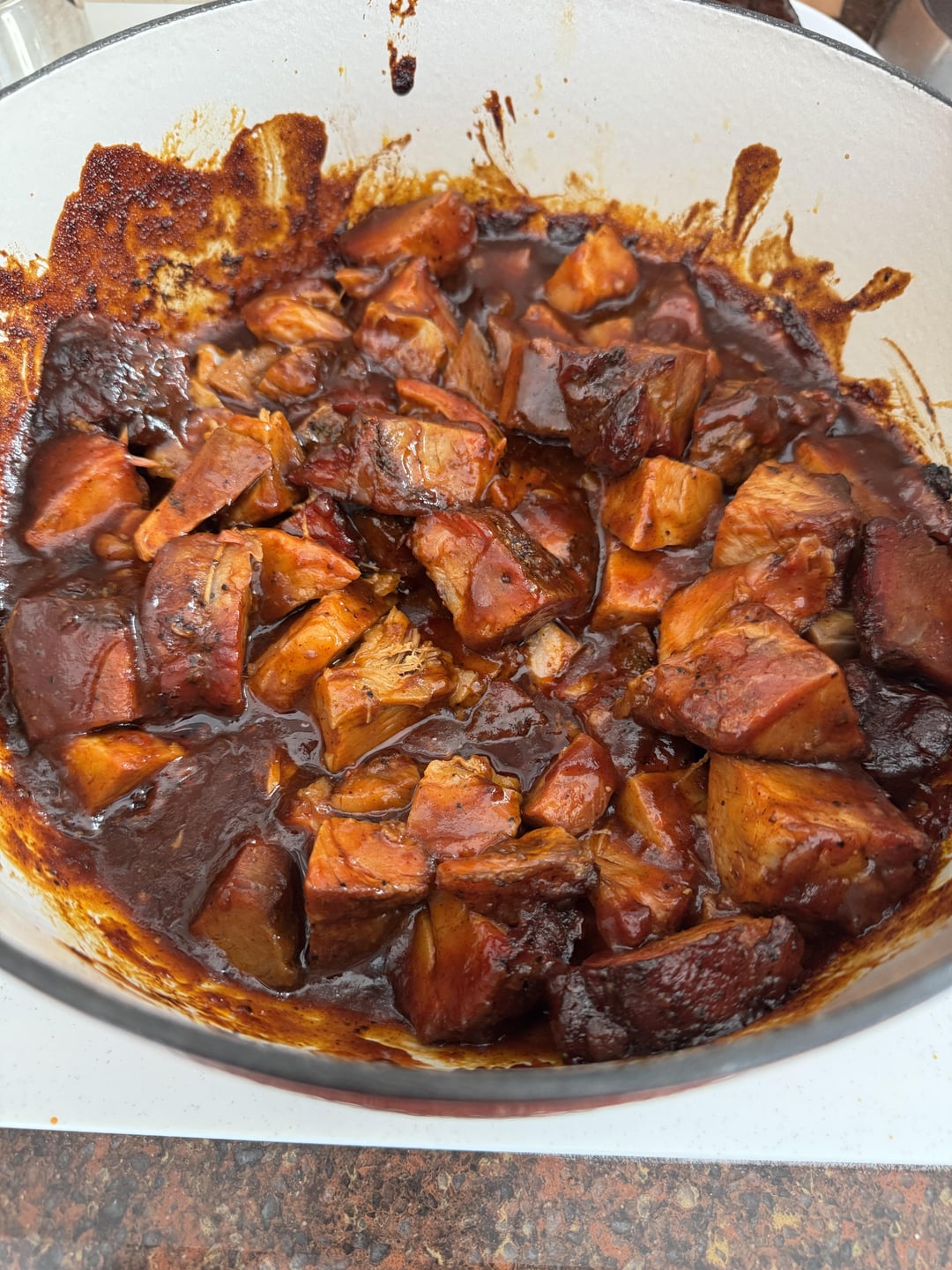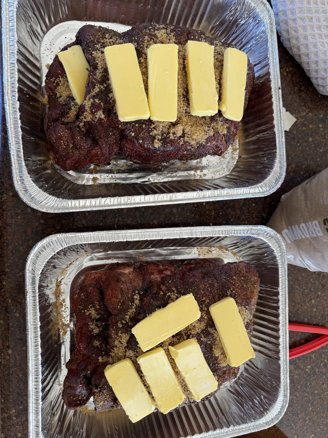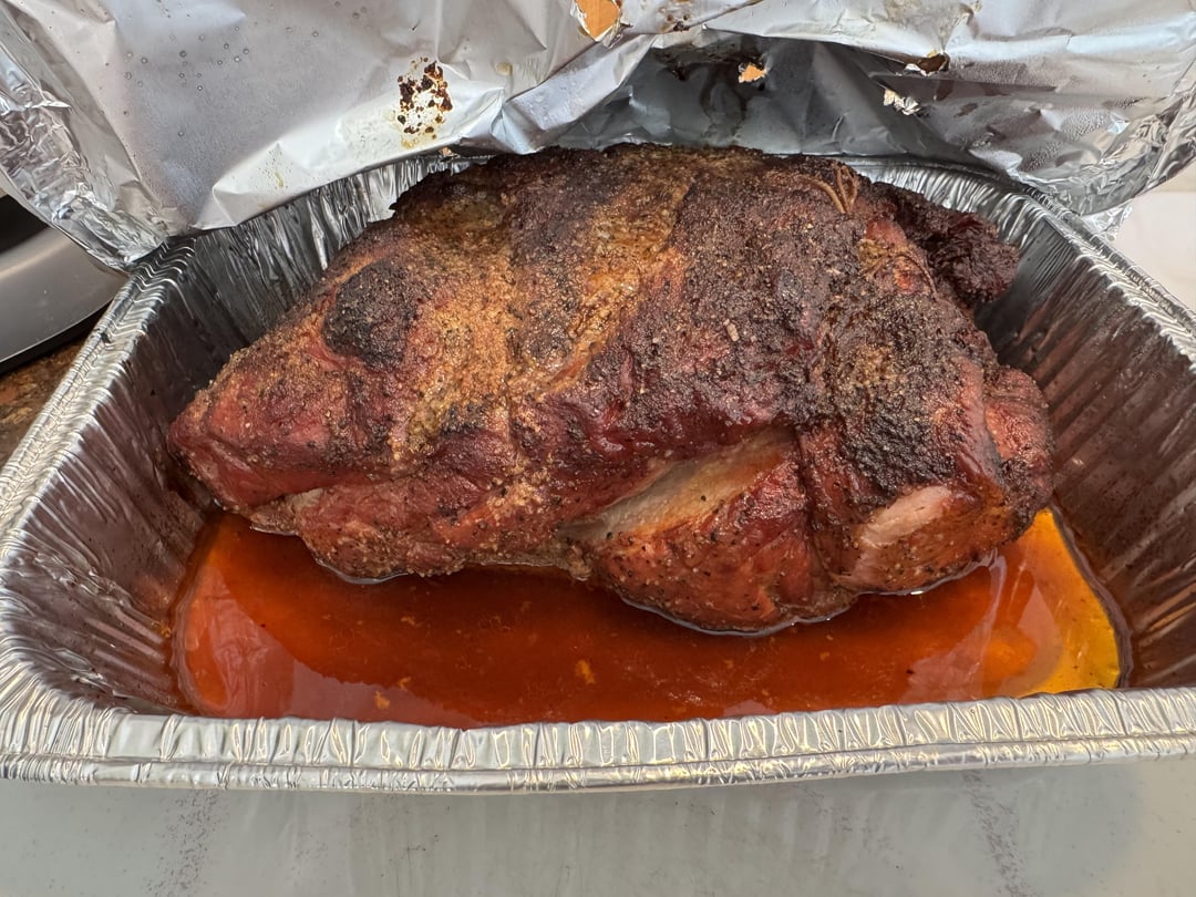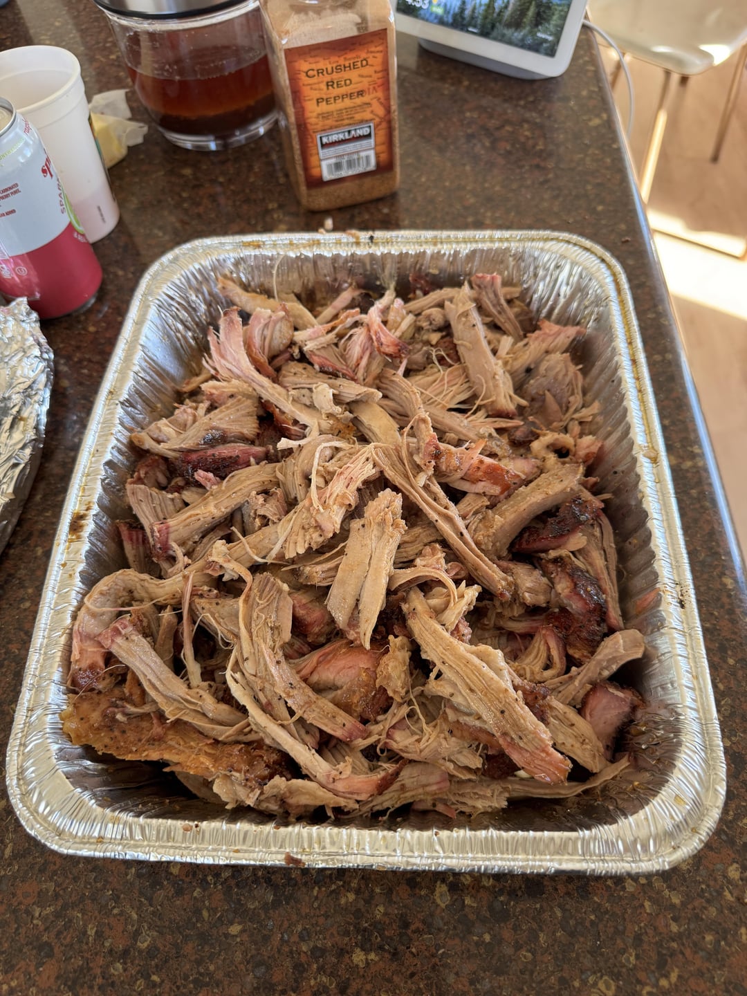 Some pulled pork I made for my birthday guests last week. Rubbed with SPG+paprika,cumin. Tied with butcher string since it was boneless. About 5.5 hours at 225. Wrapped at 165 and cooked at 275 until tender at about 202. Rested 1 hour and pulled. Made burnt ends with the one of them.