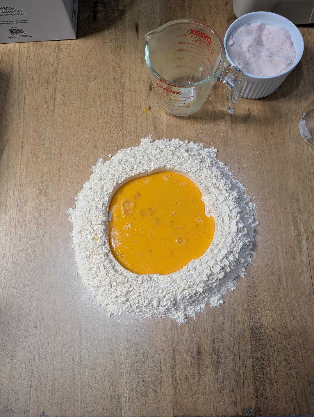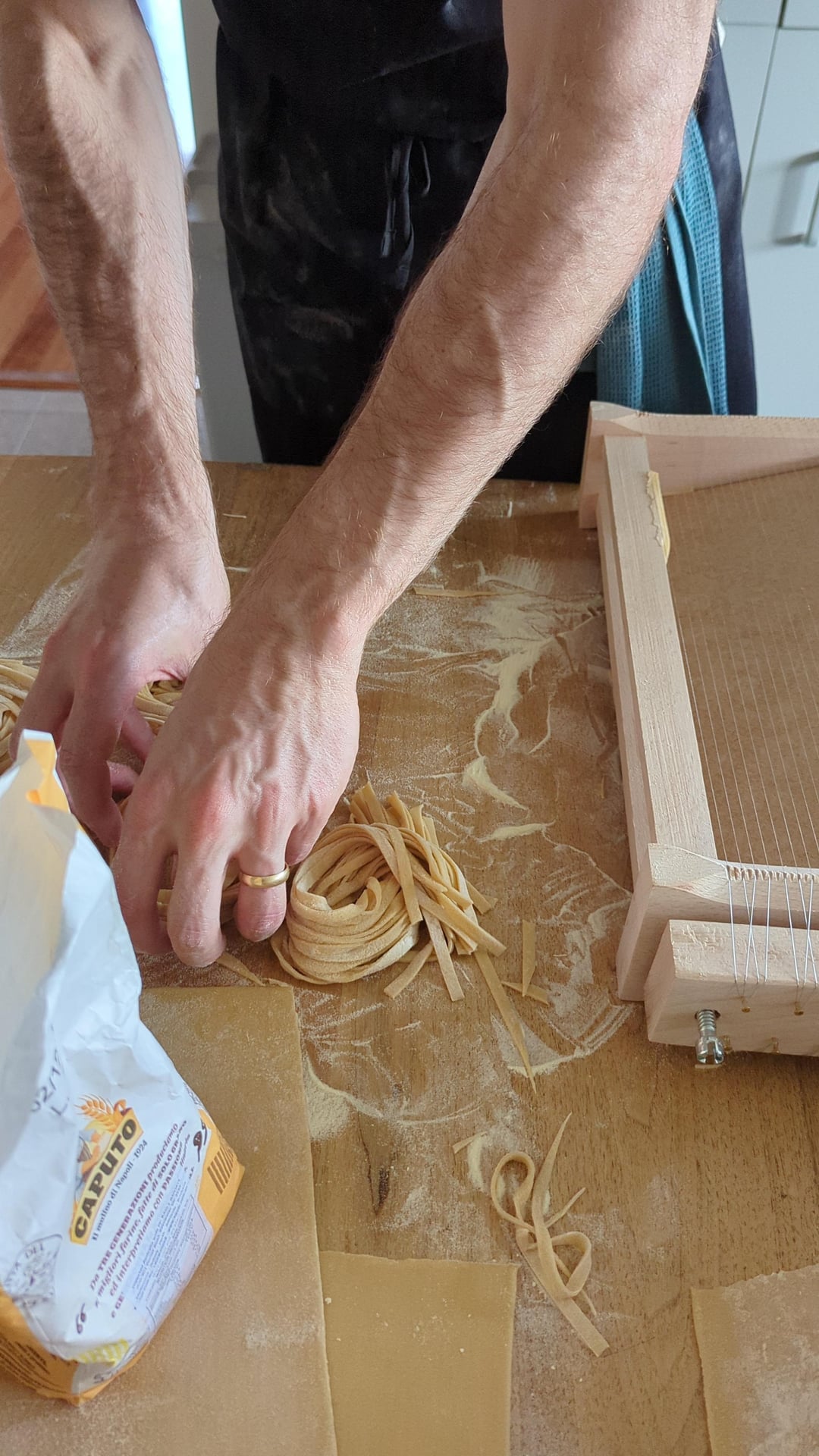 I use just the standard 100g of 00 flour to 1 egg method for the dough, a pinch of salt and semola on the bench for rolling out and non sticking etc.
