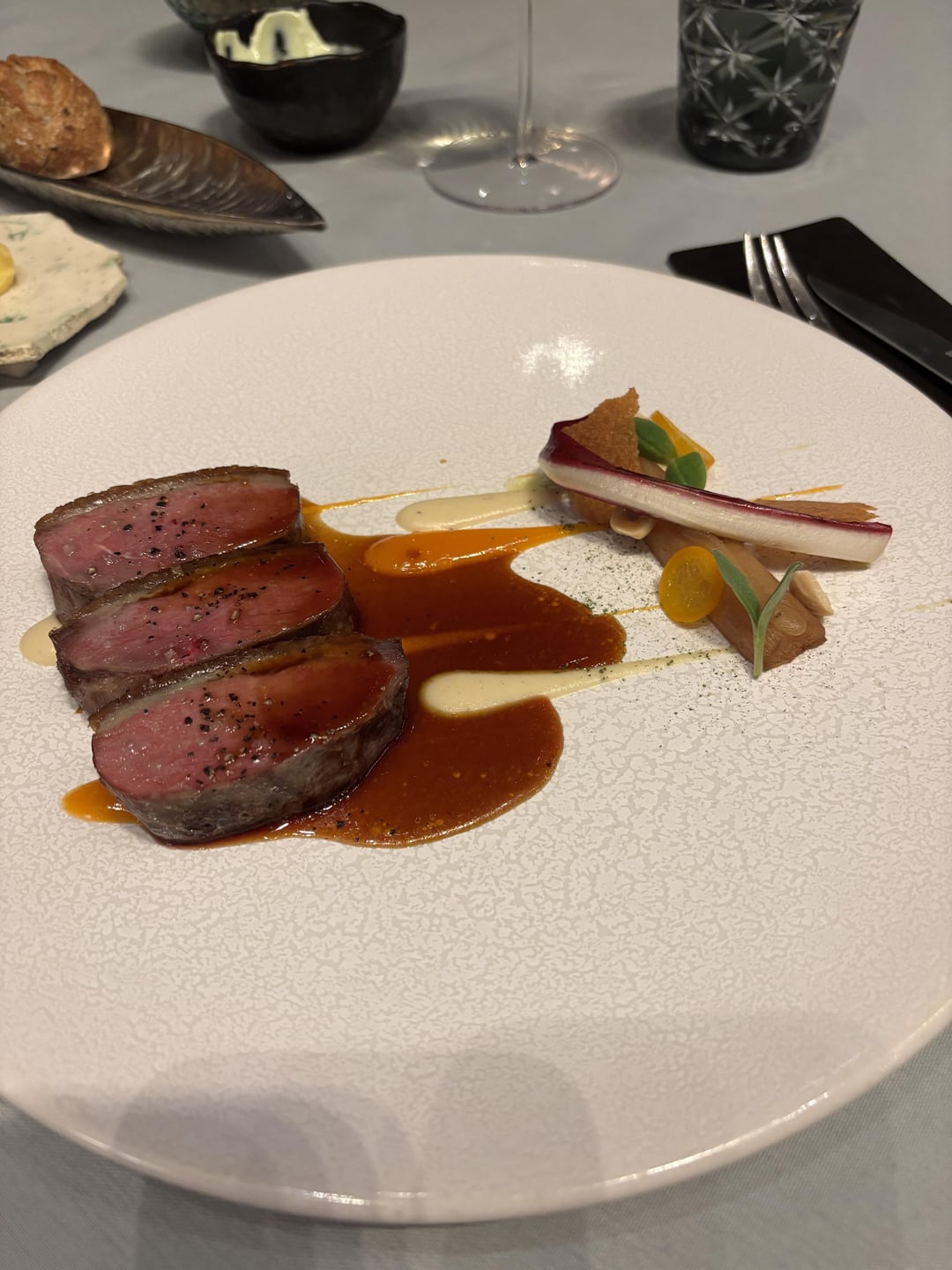 For mains, I got the classic aged duck dish and my wife got the golden bass. Both were excellent, but the duck was particularly good. Very simple in conception but perfect execution with very deep flavors.