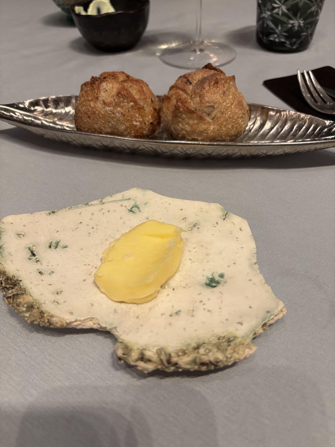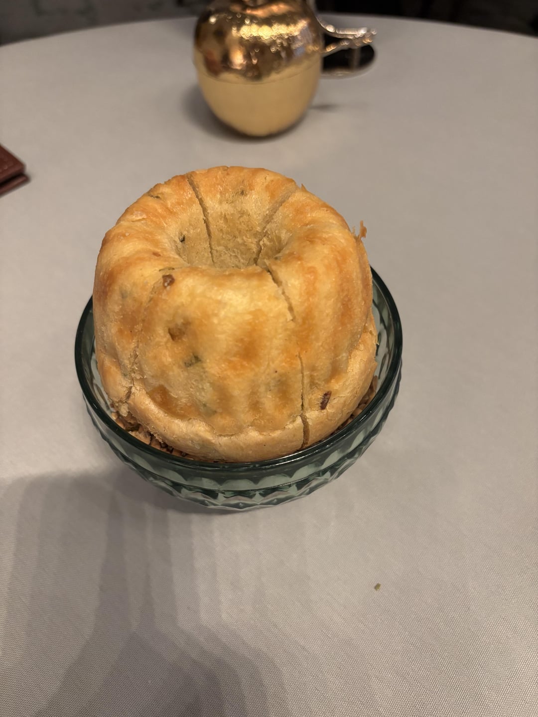 The chef is Alsatian and the many of core dishes are definitely Alsatian in inspiration. The initial bread course is a savory Kugelhopf with a fromage blanc (I think) based dip/spread. Looks just like a classic Alsatian cake but while rich is delicately herbed and very tasty.