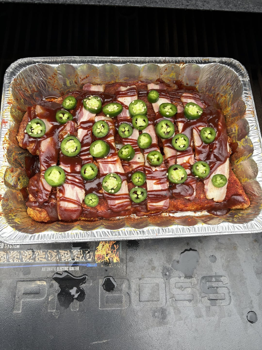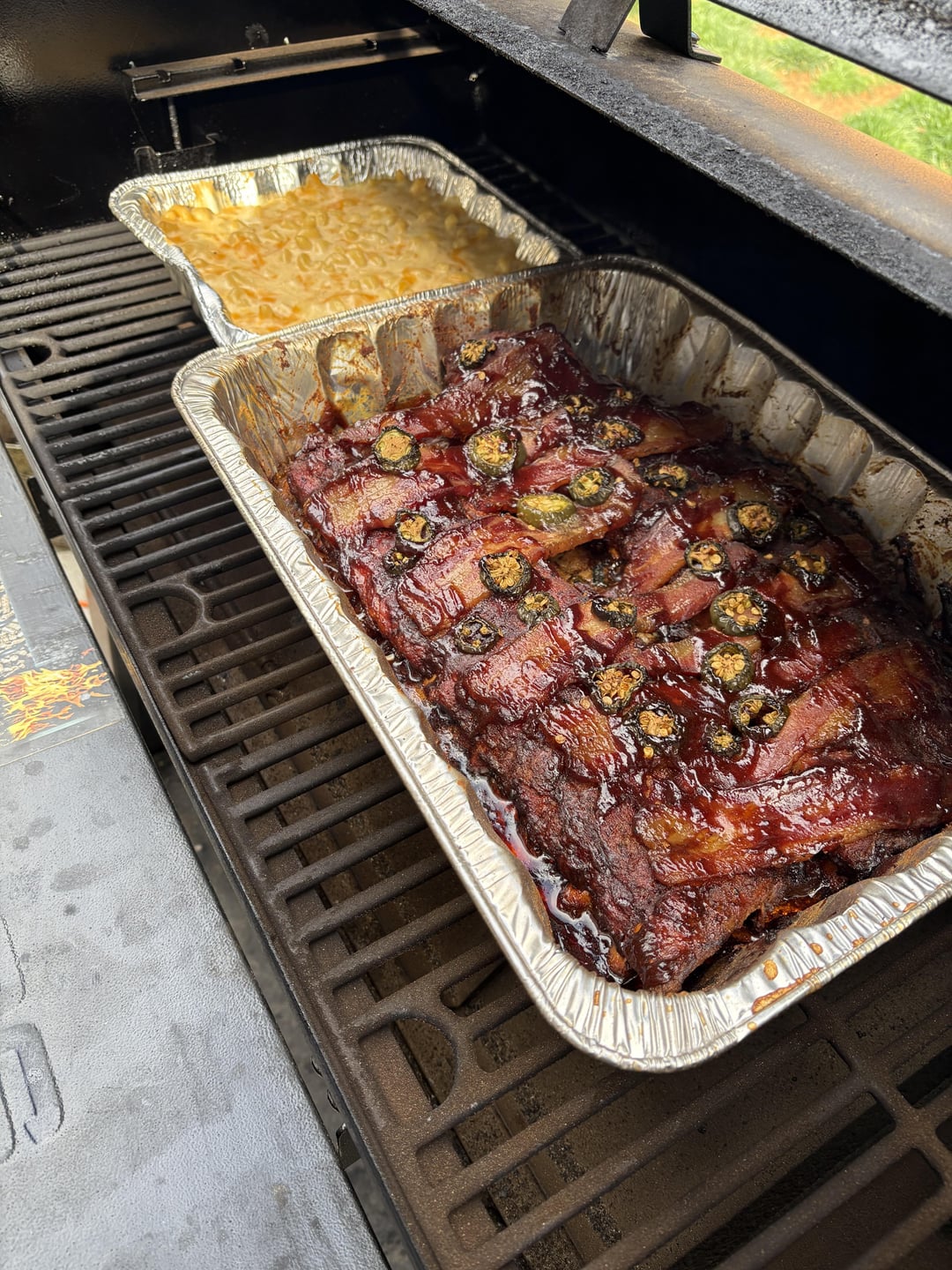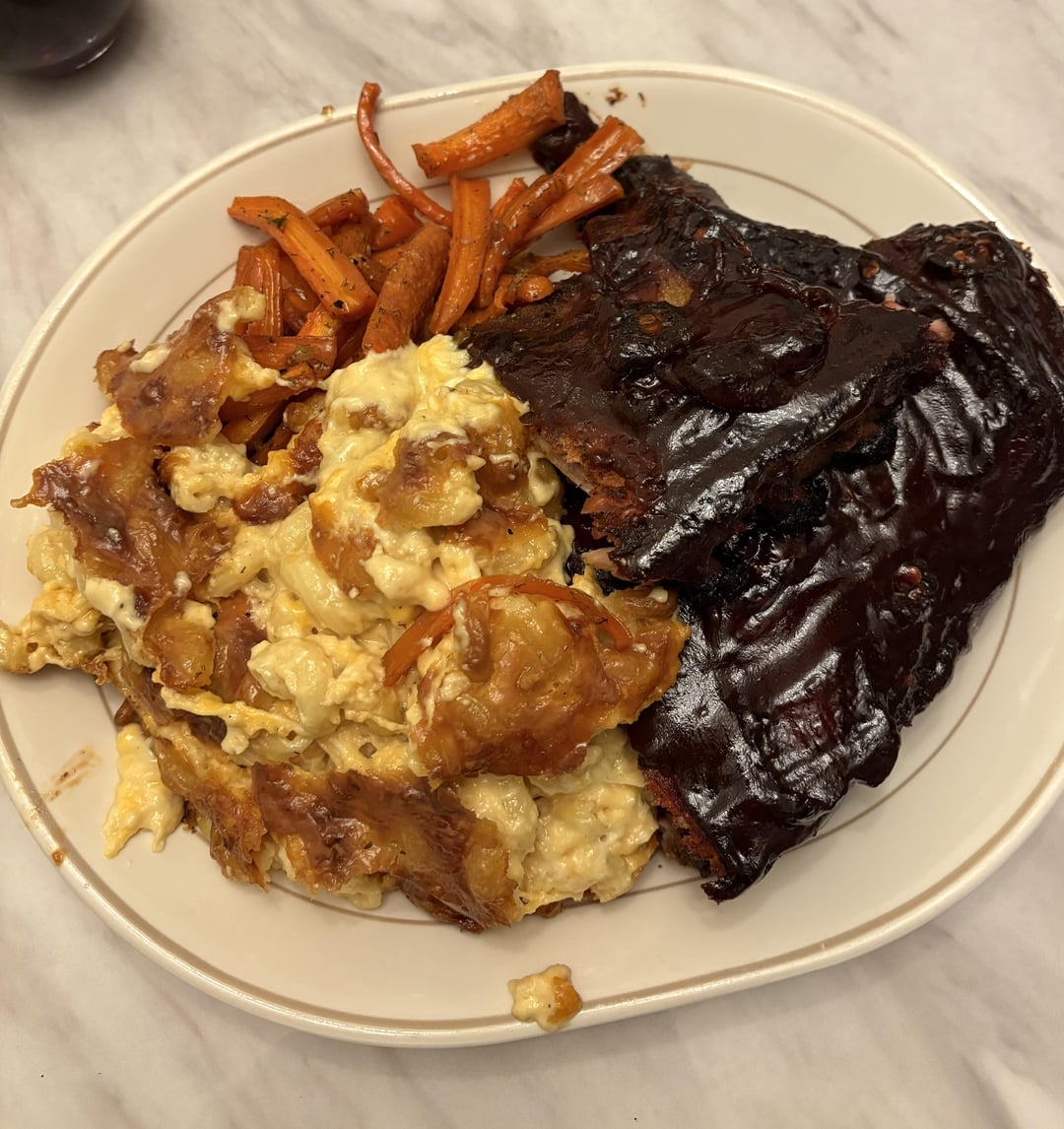 Baby back ribs soaked in beer with fresh cut bourbon soaked bacon. Homemade Mac n cheese all on the smoker. I usually do a better bbq sauce but had some sweet rays on hand so it’s what I used. Some jalapeños and paprika for the spicy kick. Honey baked sliced carrots as another side and dinner was served.