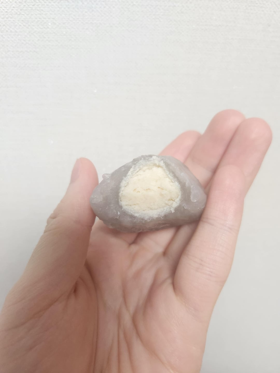 It's called Gamjatteok(potato rice cake).It is a traditional rice cake in Gangwon State that is created similarly to the half-moon rice cake using potato starch. Peel the potatoes, grind them in a grater, squeeze them in hemp cloth to sink the starch, leave the potato solids, and mix the drained starch and soaked kidney beans to knead and steam them. The color of potato rice cake is dark, but the more you chew it, the more savory it tastes. Dry the potato starch, make it into powder, knead it with hot water, add kidney beans or red beans, and steam until it becomes a transparent, then dark half-moon potato cake is made. It is called “half-moon potato rice cake” in Gyeongsangnam-do.