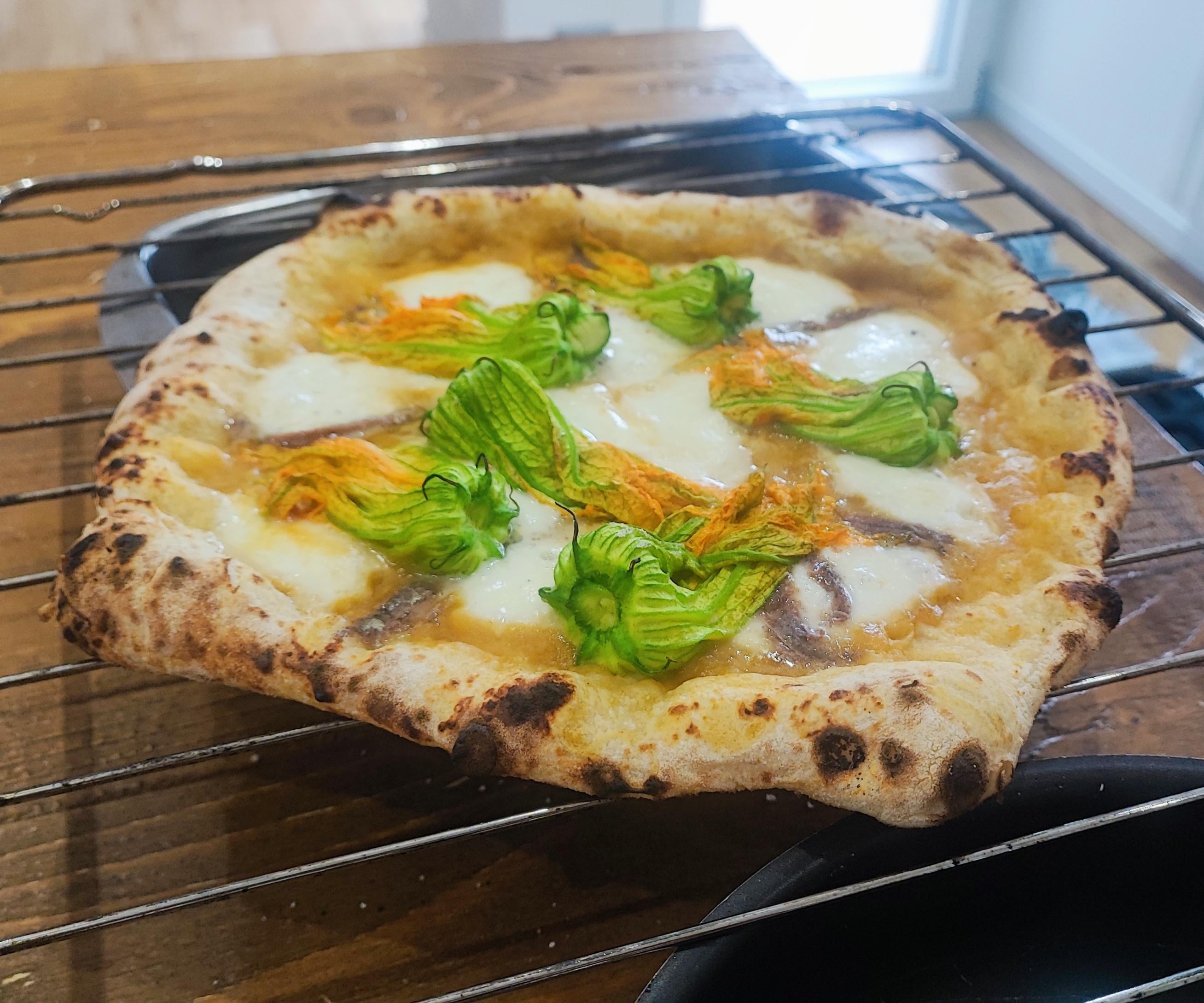 Made some pizzas, the One I liked the most Is Yellow tomato souce, mozzarella, anchovies and zucchini flowers.