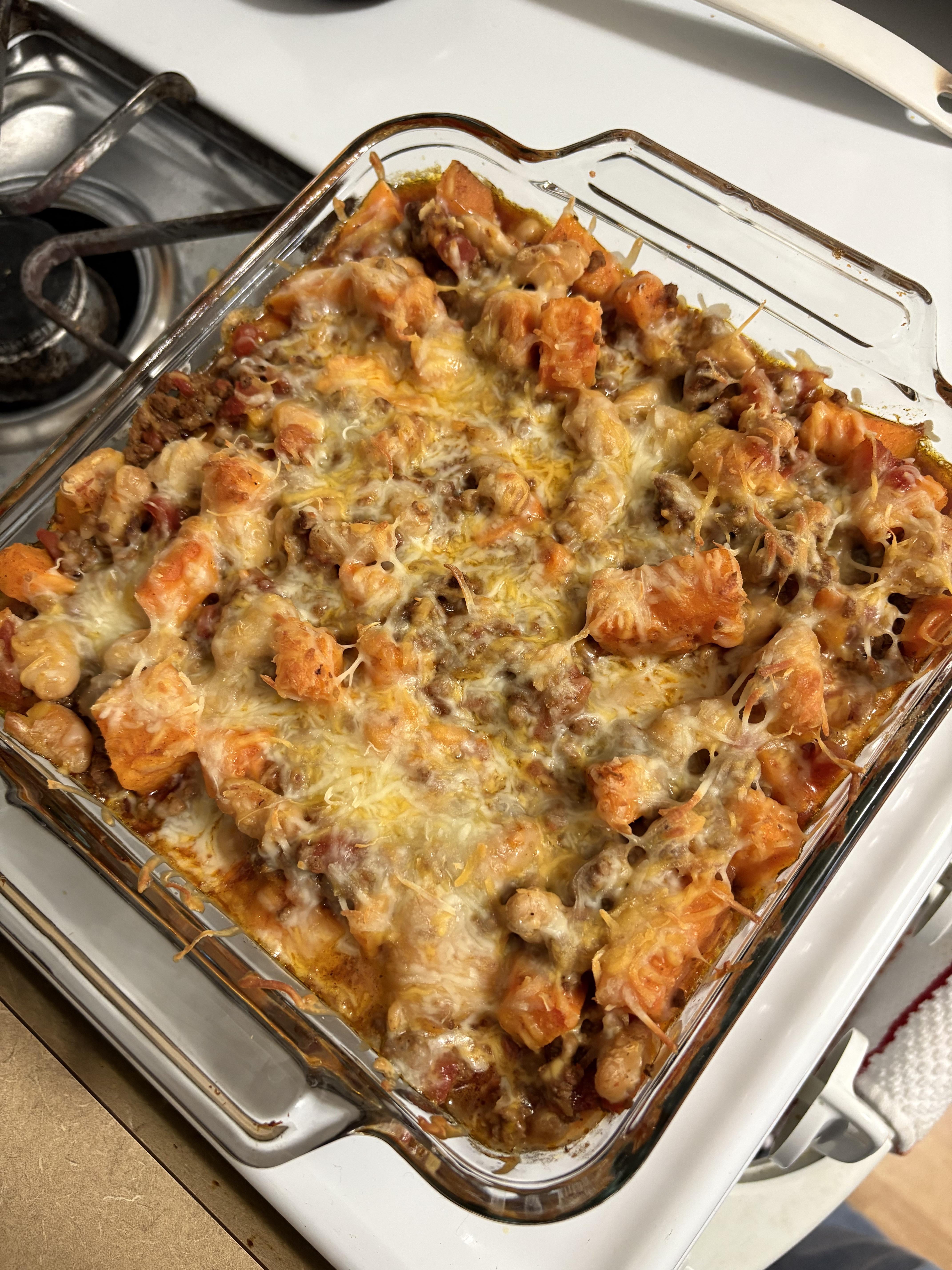 Taco meat, petite diced tomatoes with sweet onions, sweet potatoes, black beans, shredded Mexican cheese. Delicious! Made 4 servings.