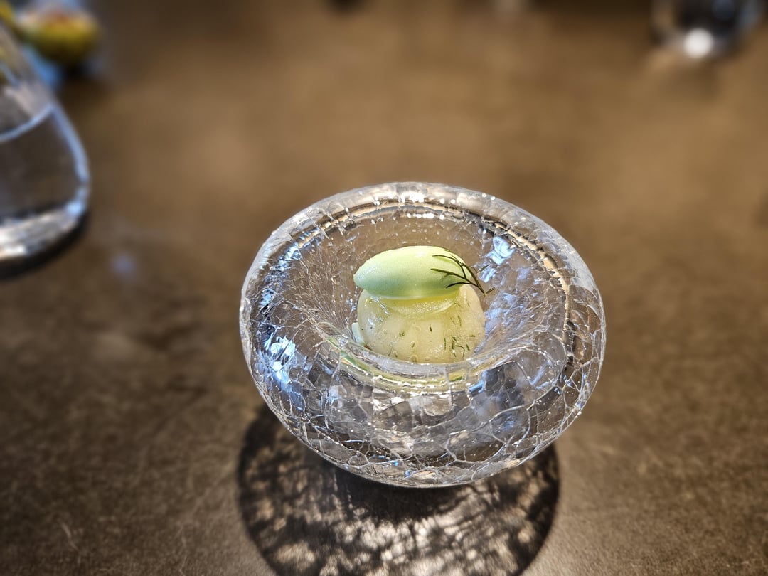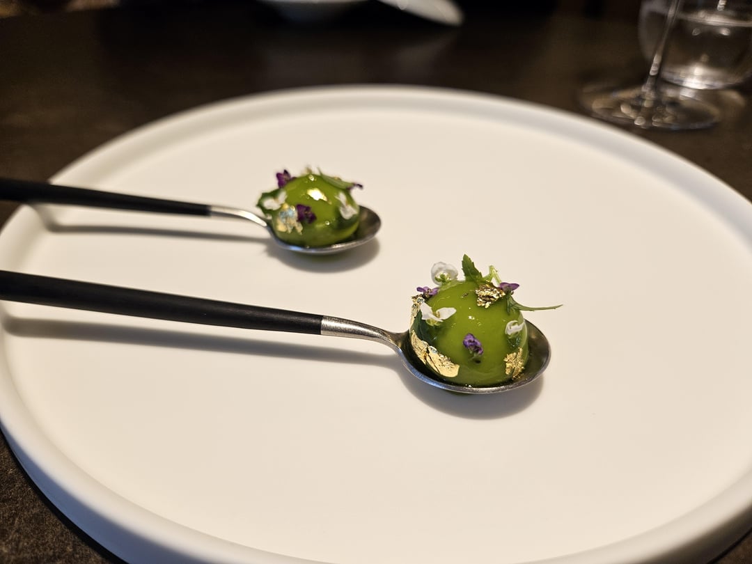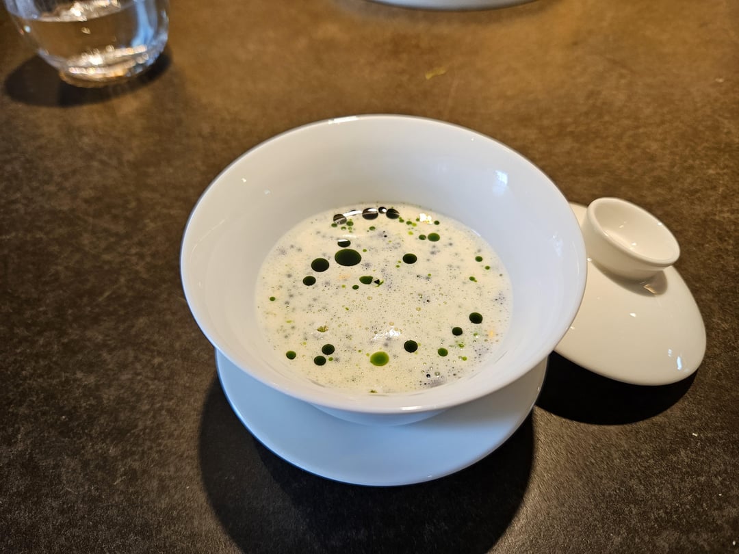 Jellied eels – unexpectedly amazing. The broth was smoky and rich, with jelly that melted into the soup in a really satisfying way. Wonderful to sip on. Palate cleanser of yuzu, avocado, and basil mousse was bright and fresh but second fiddle to the broth.