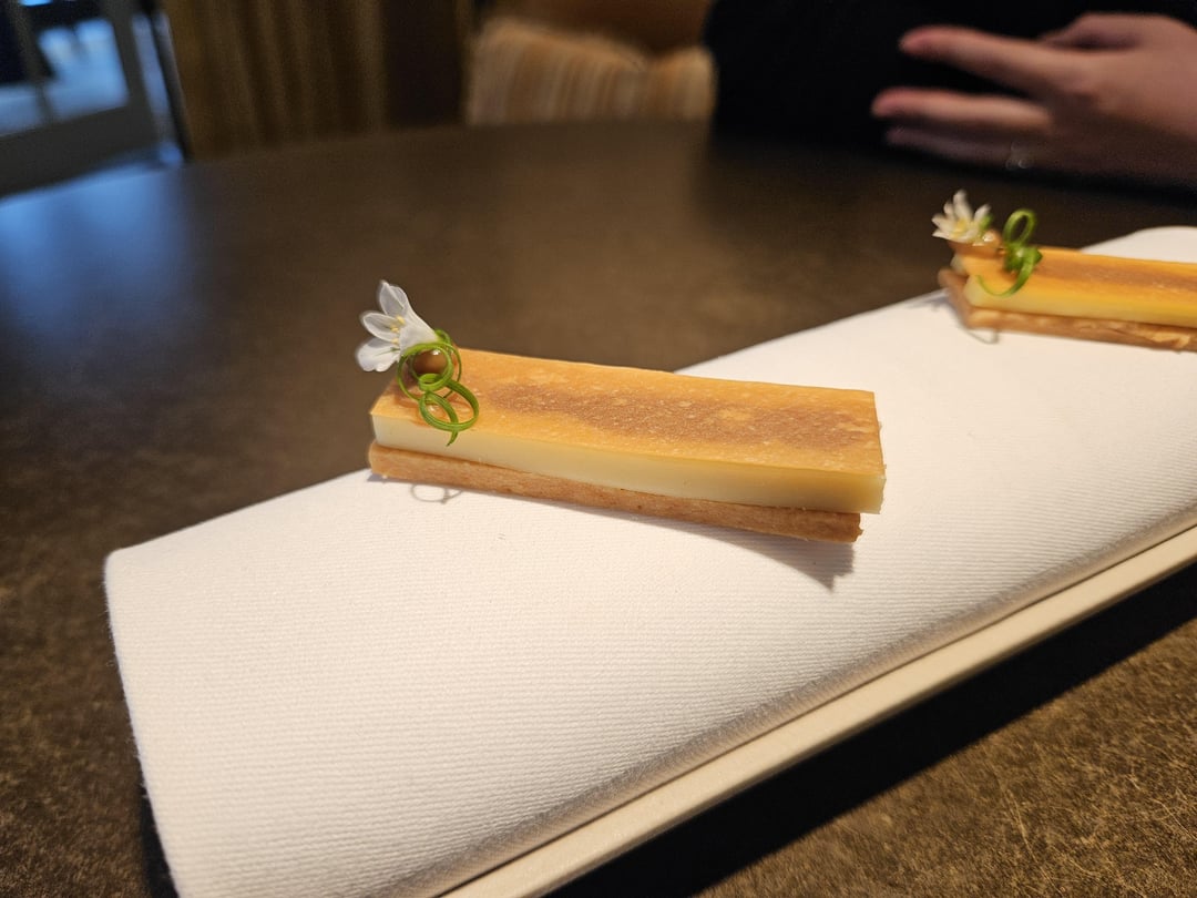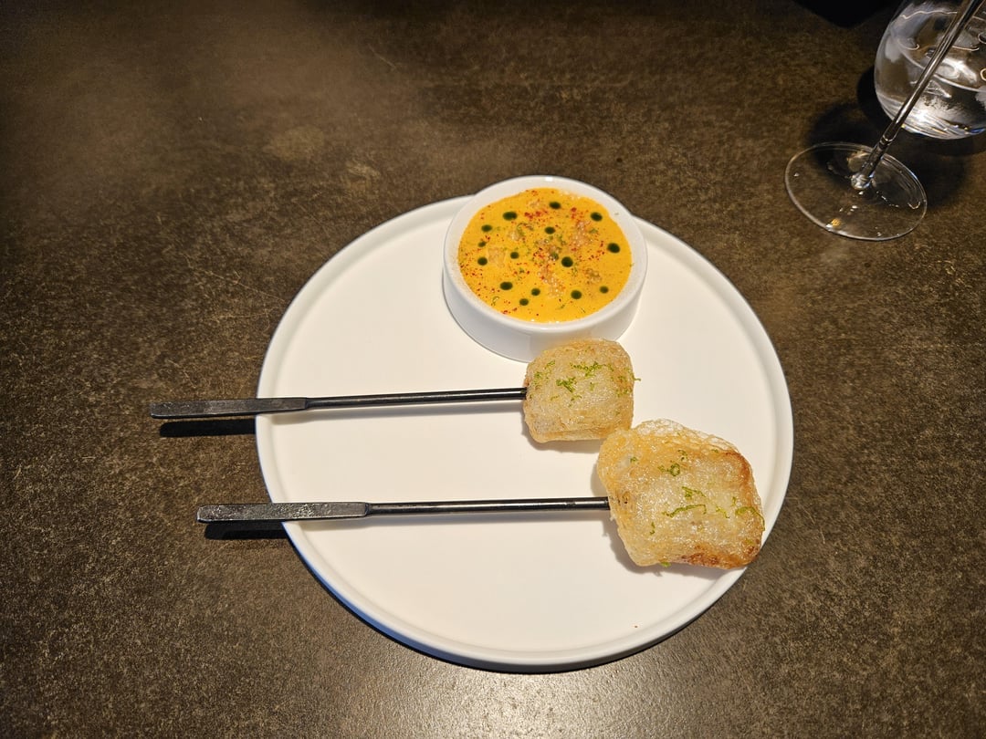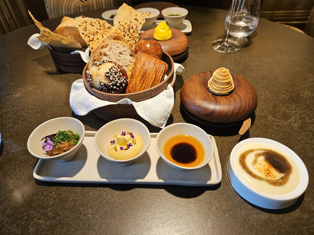 Bread course – really good bread course. Lots of dips which were fun to try. Cheese with truffle honey, lobster oil with pomegranate, miso jam, sunflower hummus. Very fun.