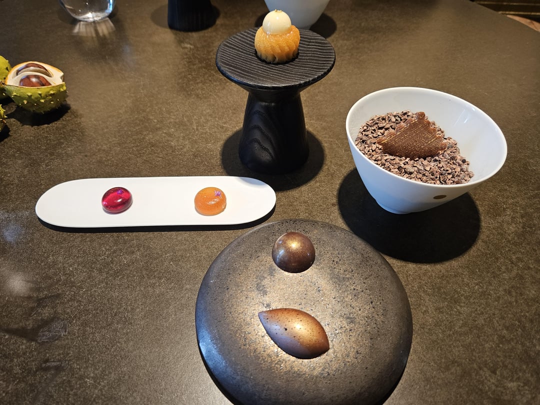 Finishing bites – truffle chocolate, chocolate caramel, rum baba, raspberry gelée. Classic flavors, well done.