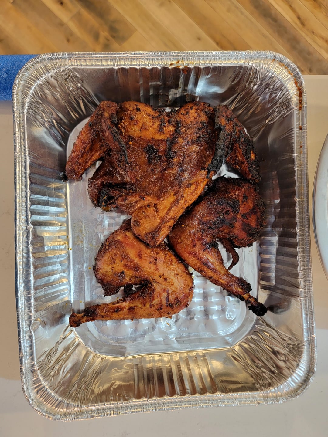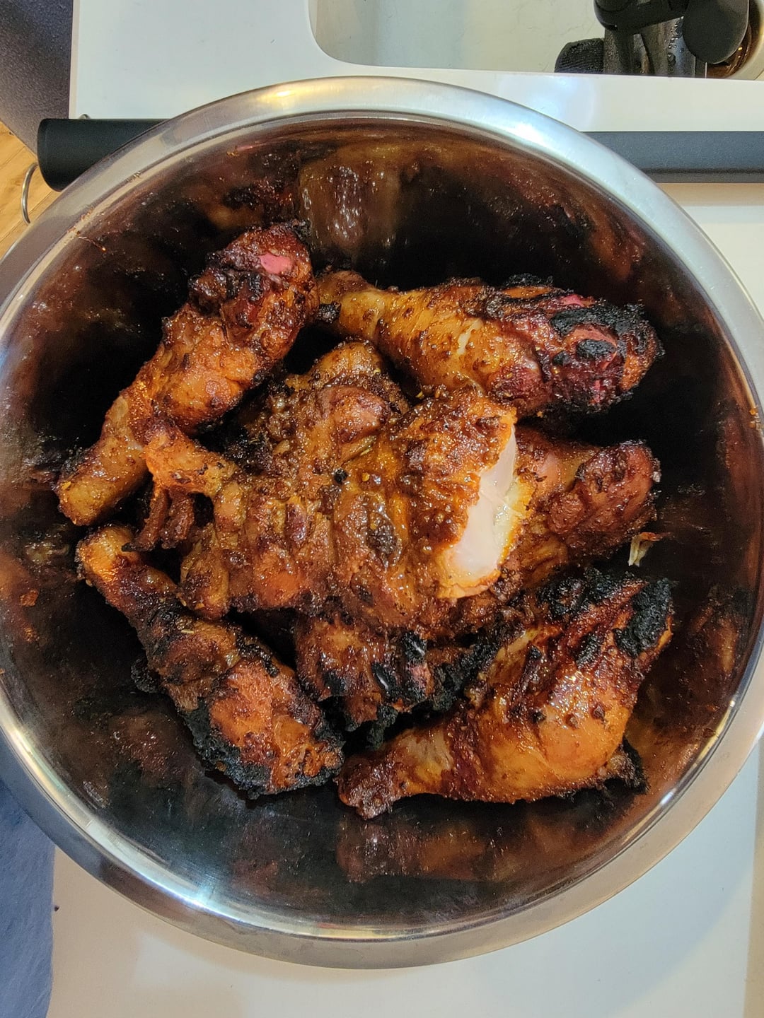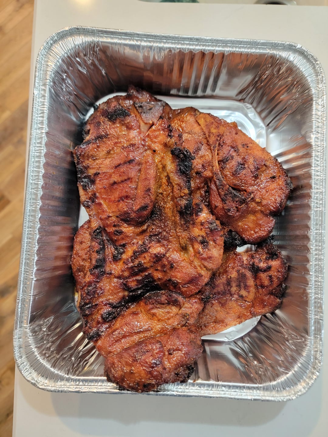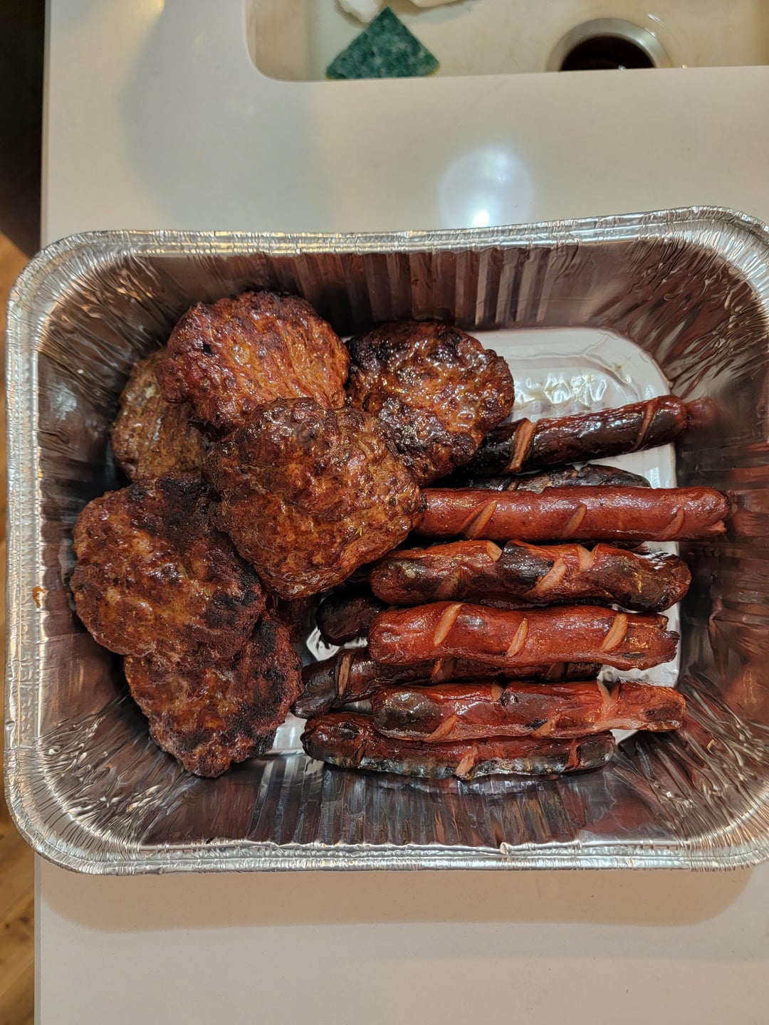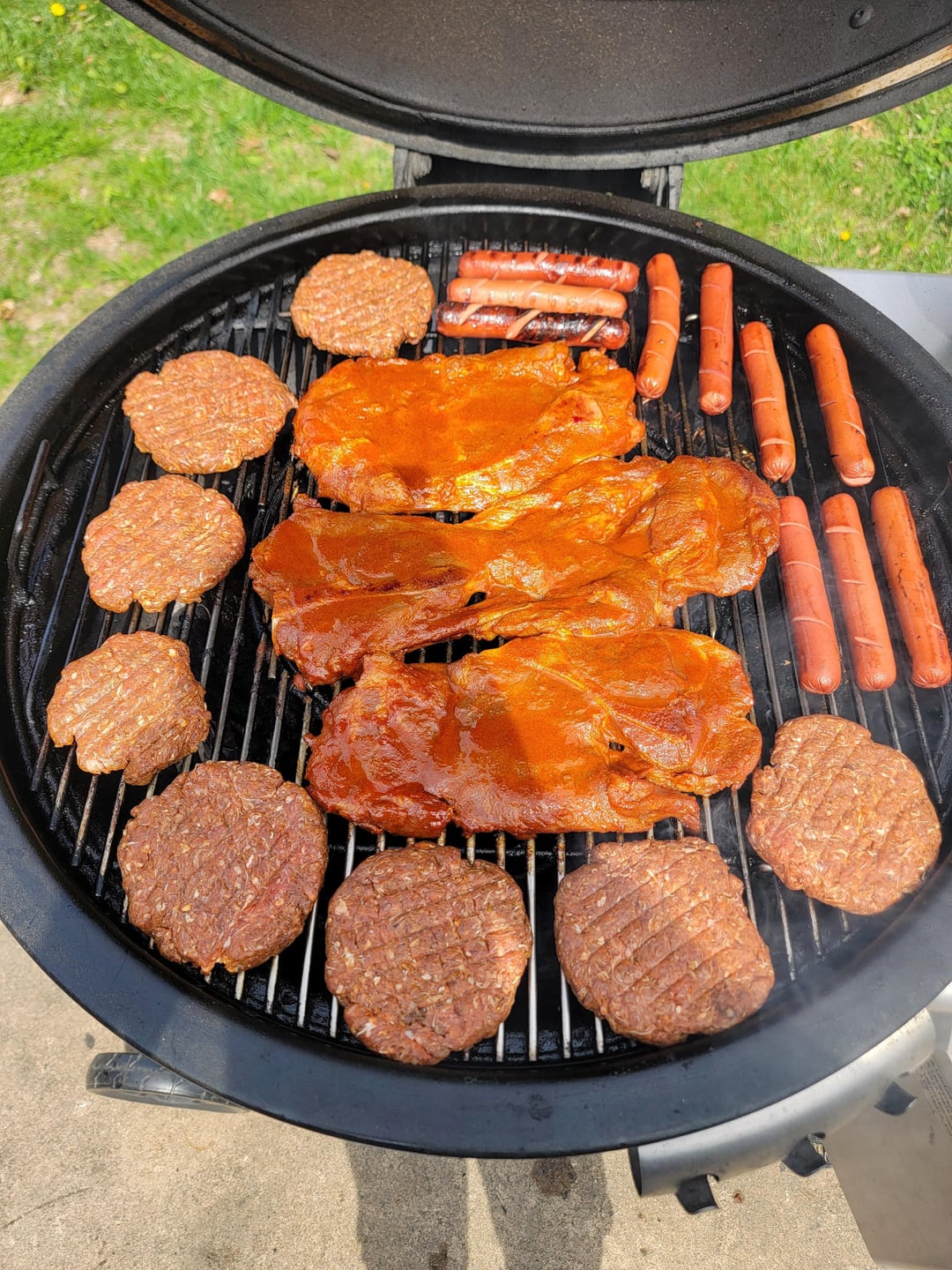 Drumsticks, thighs, pheasant, pork steaks, beef/lamb burgers, hot dogs.