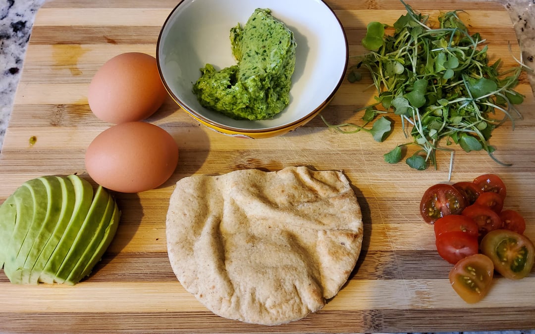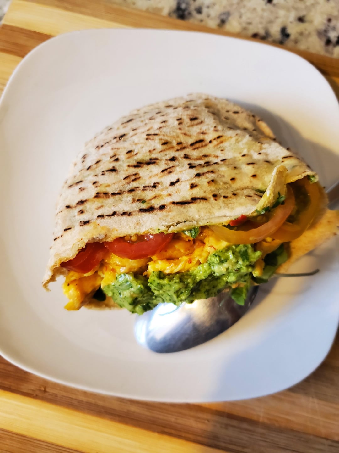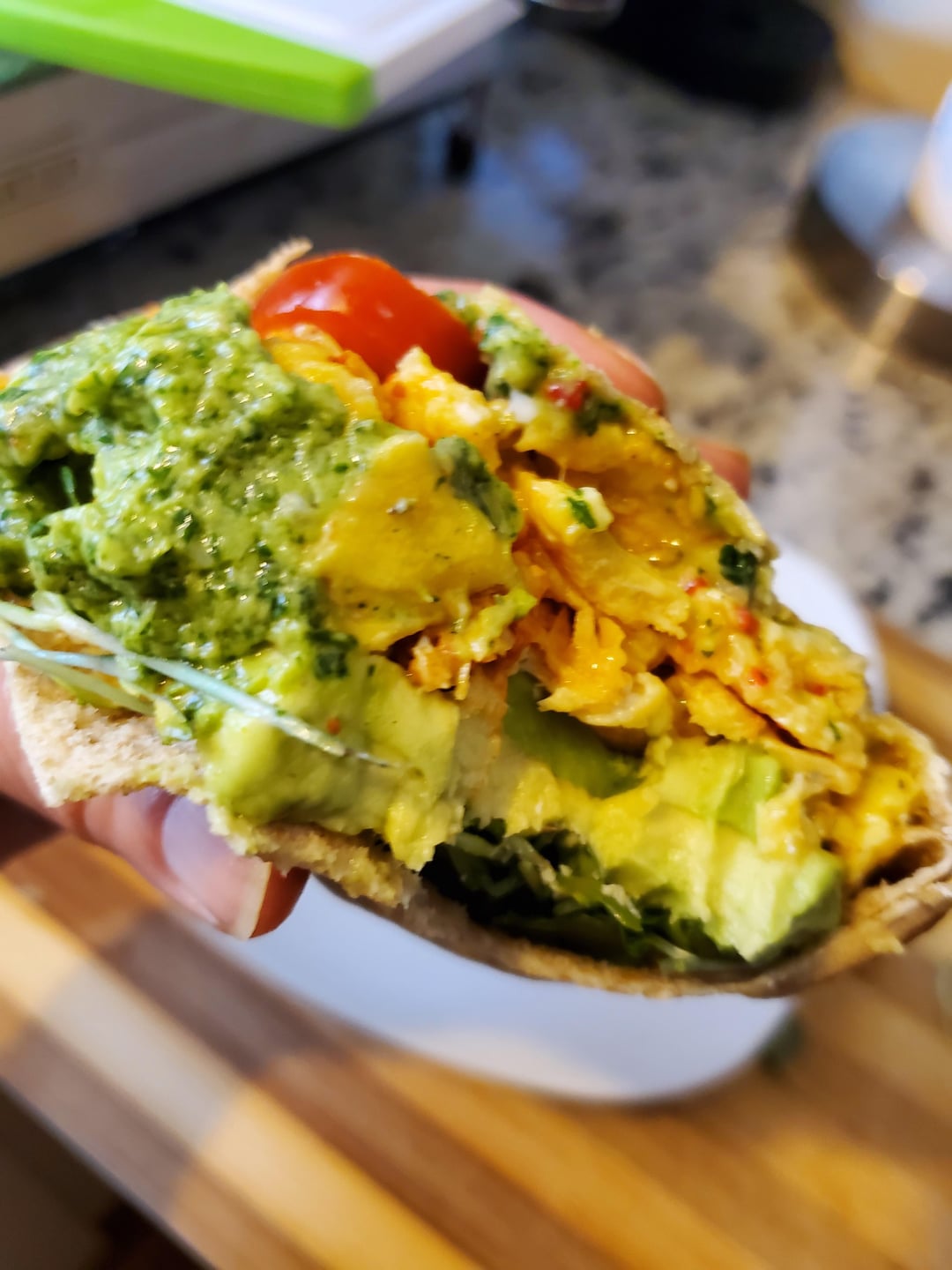 Made a healthy pocket breakfast sandwich for a change. Soft scrambled eggs topped with hot chili pepper paste, sliced avocado and grape tomatoes, microgreens and homemade avocado cilantro sauce.