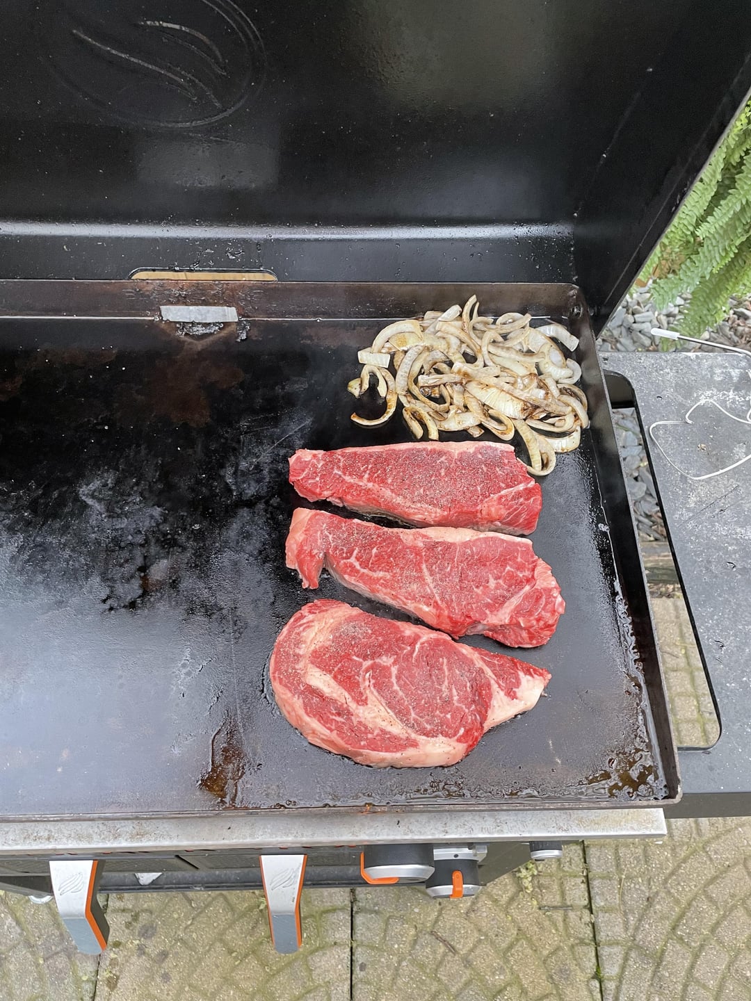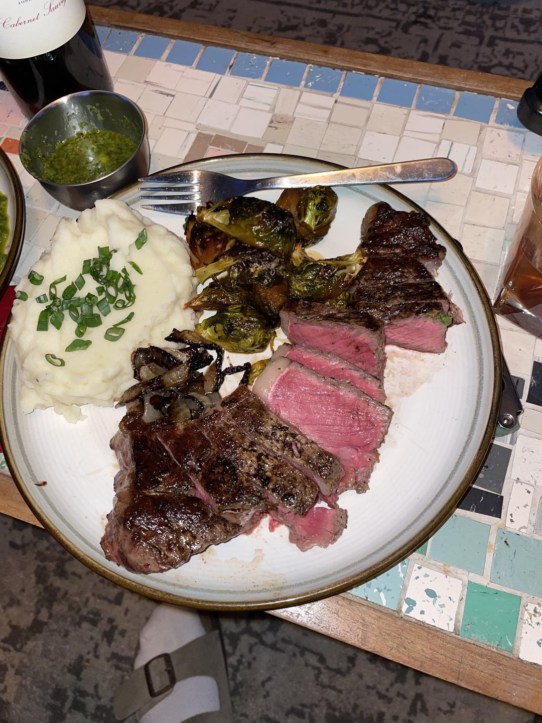 I like to cook steak often. I’m in my mid/late 20s and think I have a good method down. Used a black-stone this time. One ribeye and two New York strips. Only used salt and pepper. Cooked to 120 then let sit. Served with Japanese soy ginger Brussels sprouts. Caramelized onions. Garlic roasted mash potato’s. And a nice cab. Lmk what yall think