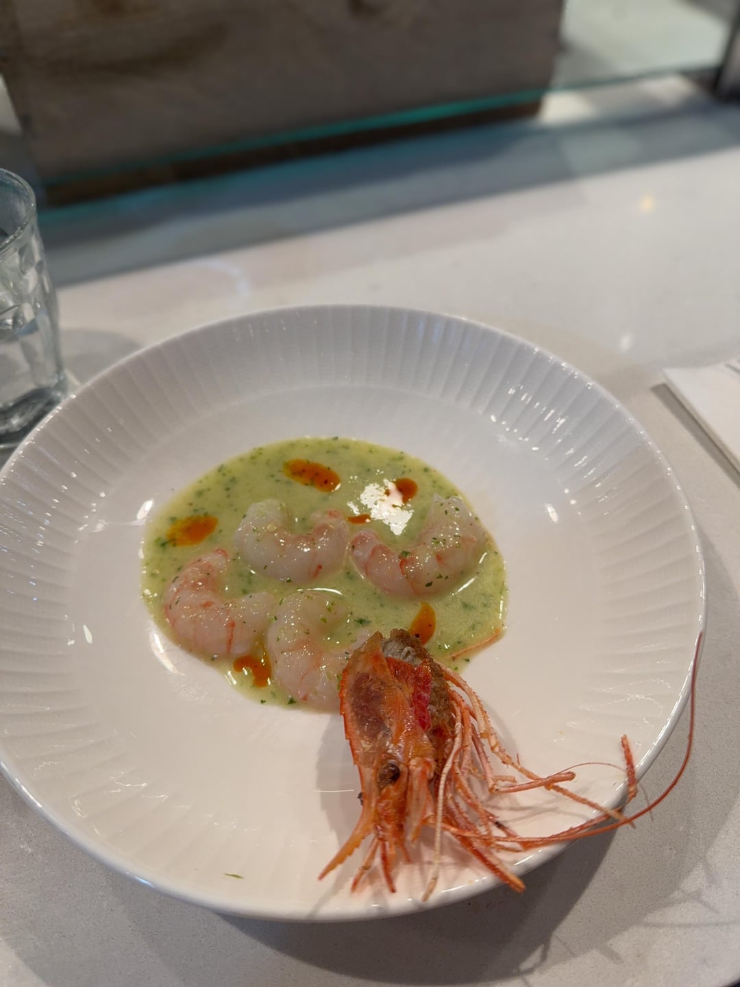 Deep water Kauai prawns in green achuachile, crispy headTostada de Pate con Callo