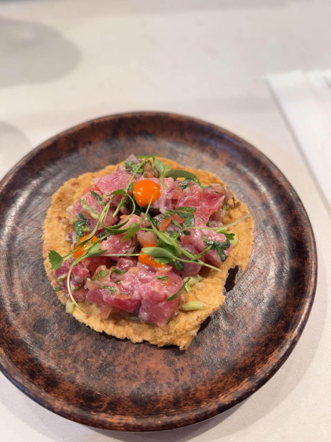 San Clemente Island bluefin tuna ceviche, housemade tostada raspada, avocado puree, arbol-peanut sauceAguachile de Camaron
