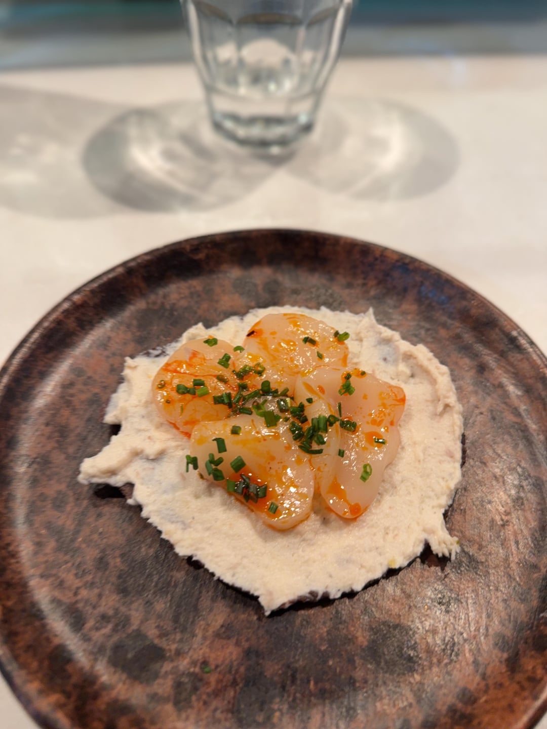 Kanpachi head pate, diver scallops, almond chili oil, chives, lime juiceKingfish Crudo