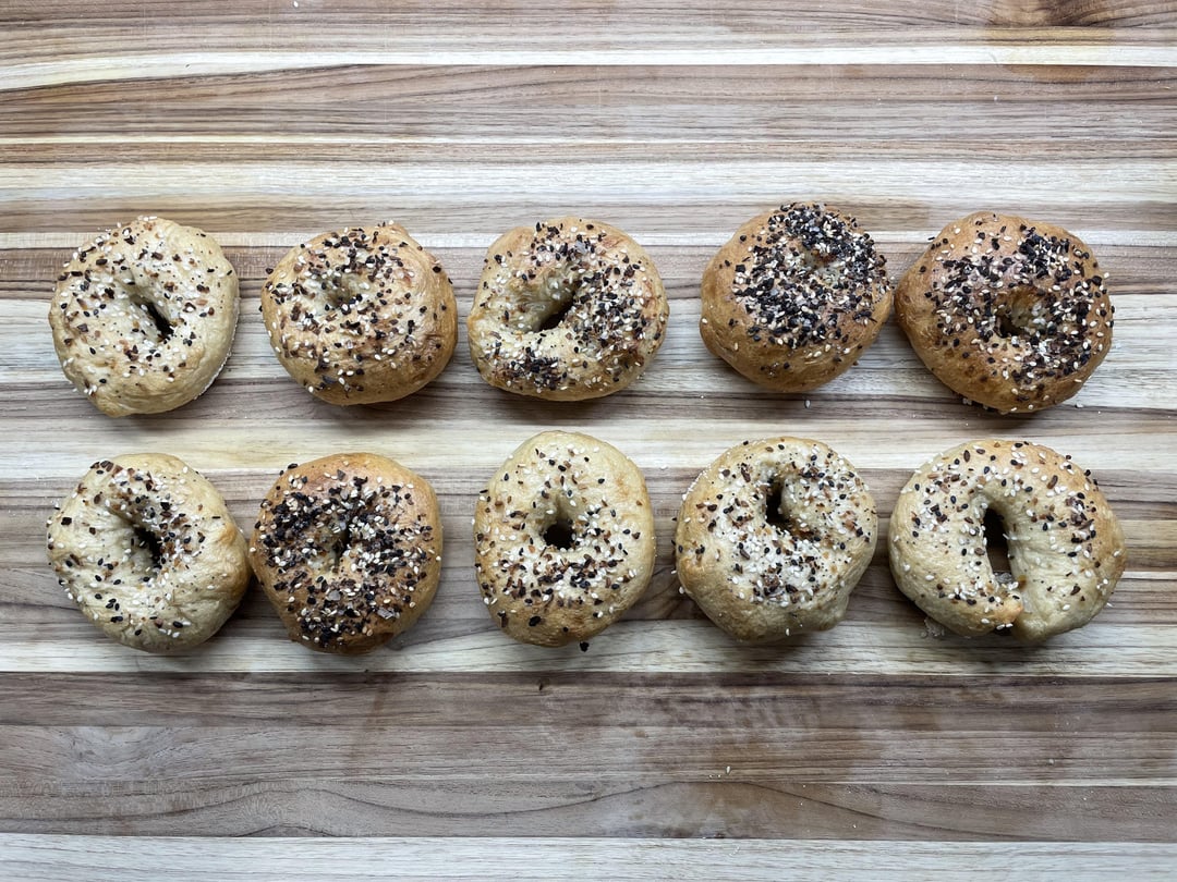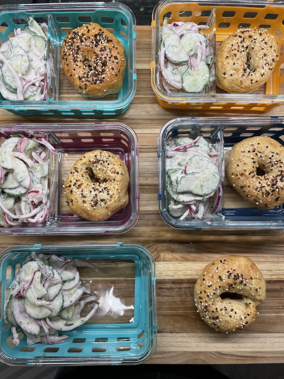 for meal one, i made cucumber salad (https://minimalistbaker.com/creamy-vegan-cucumber-salad-german-inspired/#wprm-recipe-container-79522), homemade everything bagels, and a chickpea salad to smear on the bagels (not pictured)
