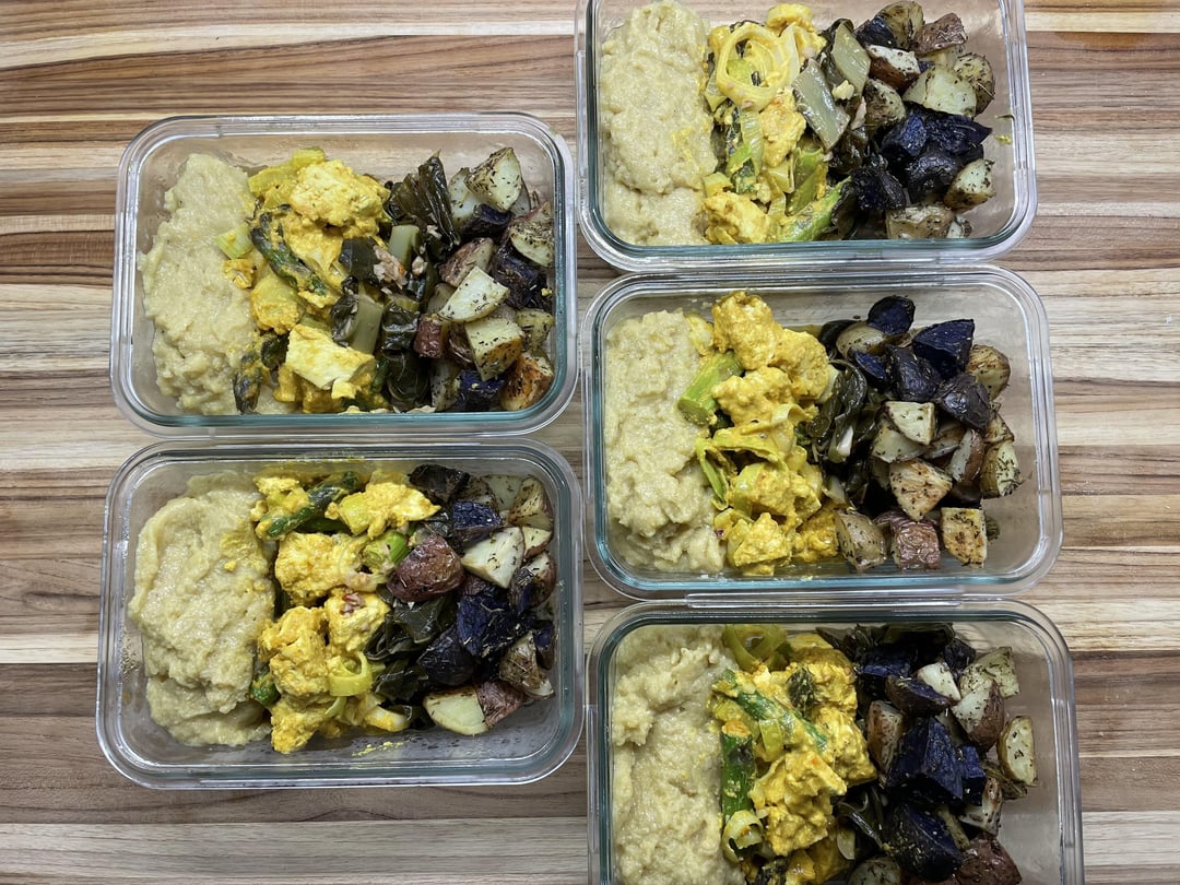 for meal two, i made grits, scrambled tofu (https://rainbowplantlife.com/eggy-tofu-scramble/#wprm-recipe-container-11576 ) with leeks and asparagus, garlicky collard greens, and herby potatoes.