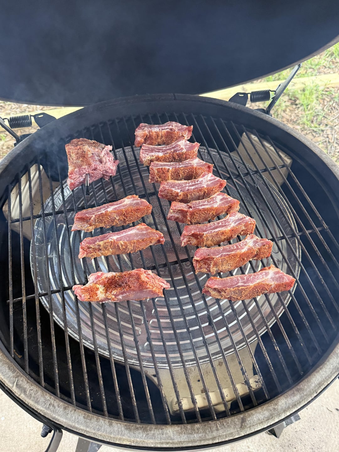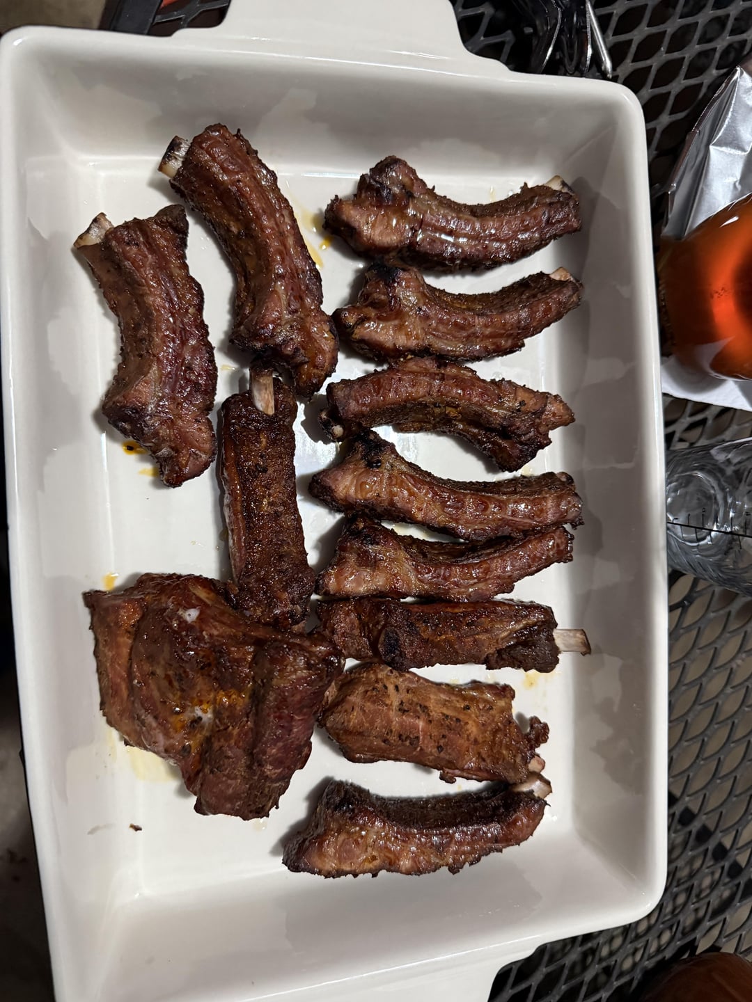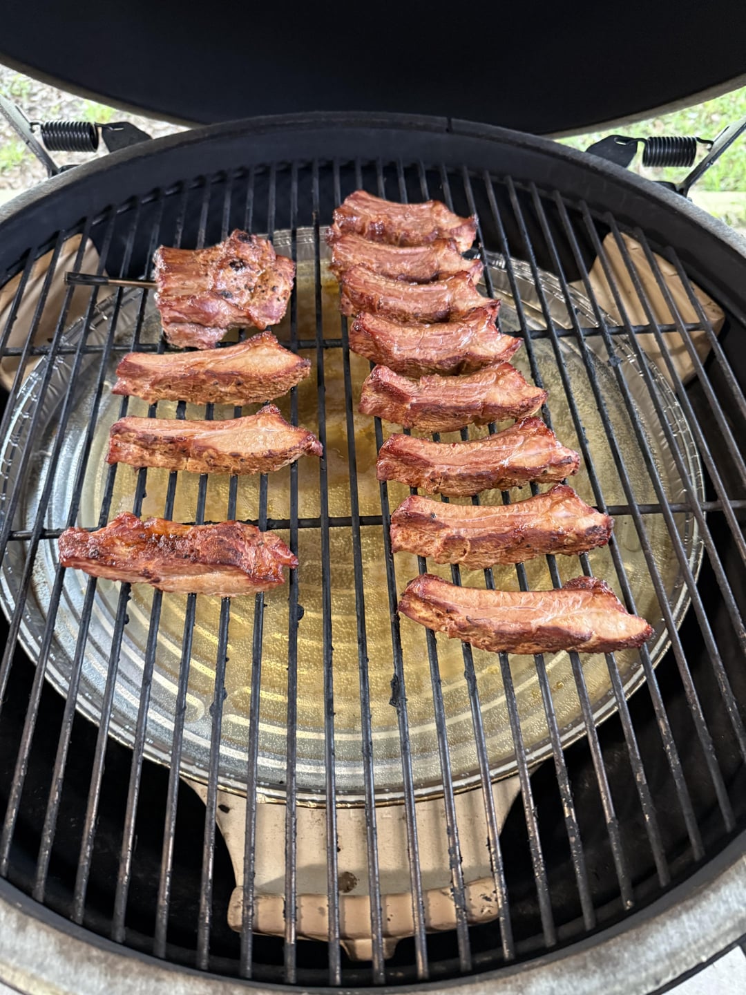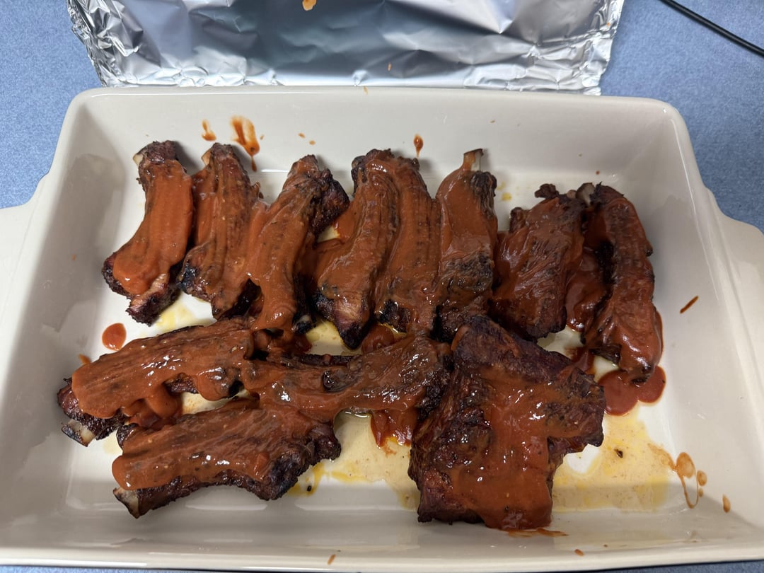 First time doing ribs. Did party ribs for the wife and me and I was extremely happy with how the turned out. Smoked at 275 for about 3 hours, then put my homemade bbq sauce and some local honey and let them braze under some tin foil on the grill for another 20 minutes. Shout out pistol Pete’s (local seasoning)