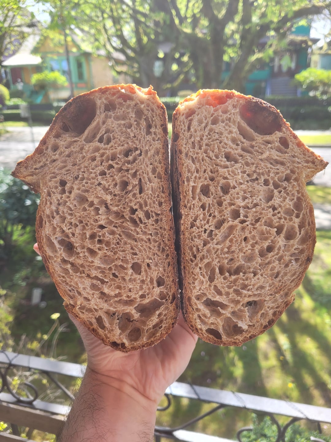 Pushed the bulk on this 50% whole wheat loaf to 130ish% increase and very pleased with the super even and open crumb structure – taste is phenomenal as well