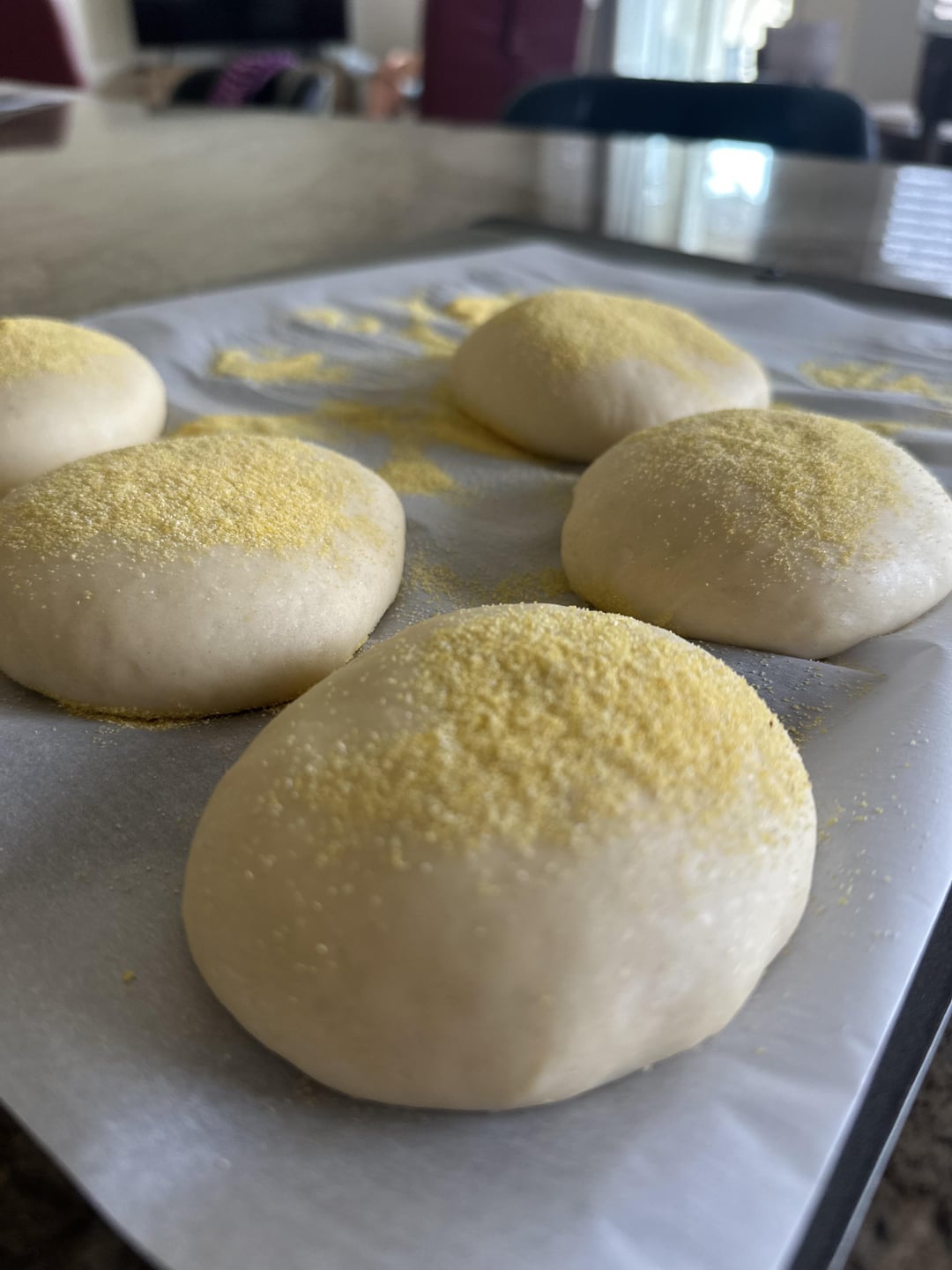 I have wanted to make English Muffins for a few decades. Seriously! They were so easy. I “baked” them on the stove top on a cast iron griddle pan. My biggest concern was whether or not they would be cooked thru. My husband came into the kitchen wanting to try them so I cut into one with a fork and it was cooked perfectly. My only complaint with the process was that I made a mess of my stovetop (cornmeal everywhere!). The recipe is from a blog called “Powered by Mom”. I will put the recipe link in the comments if I can.