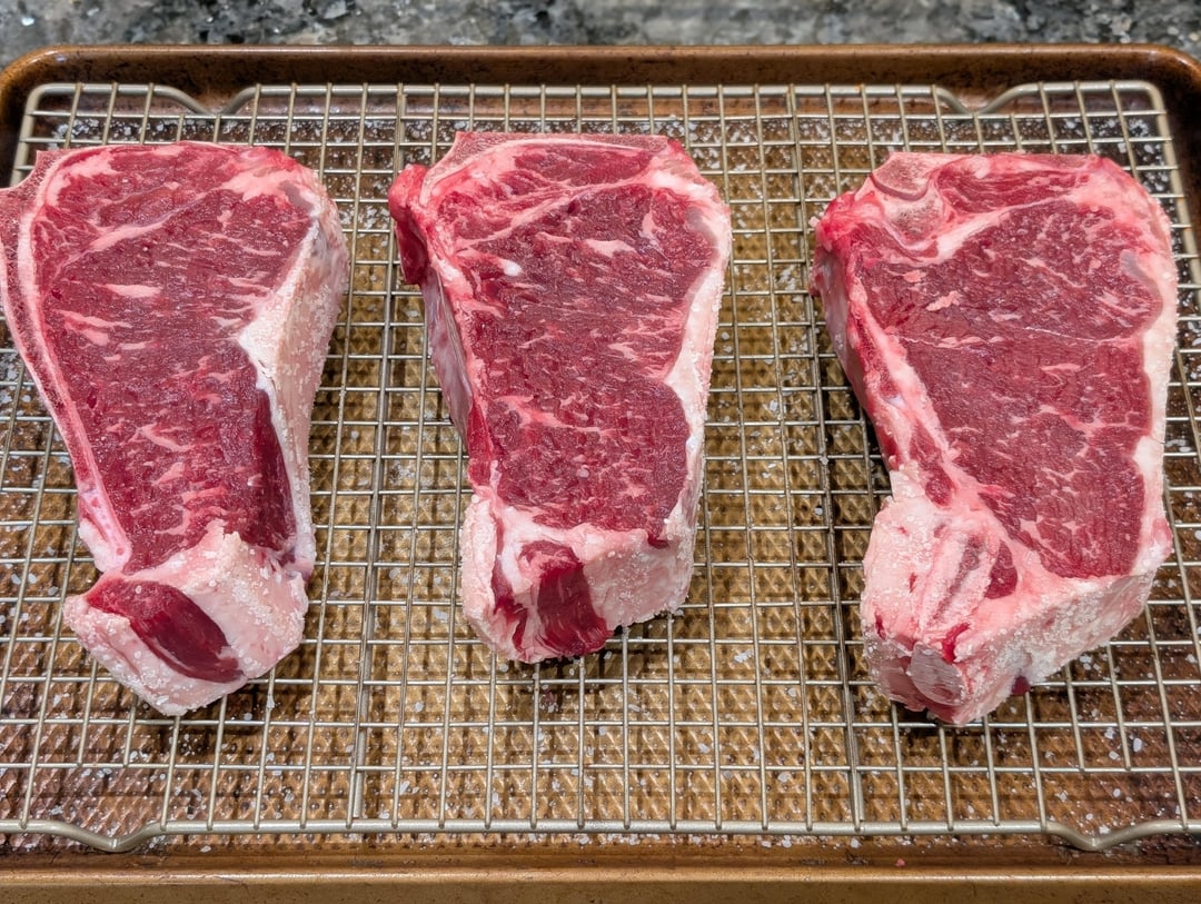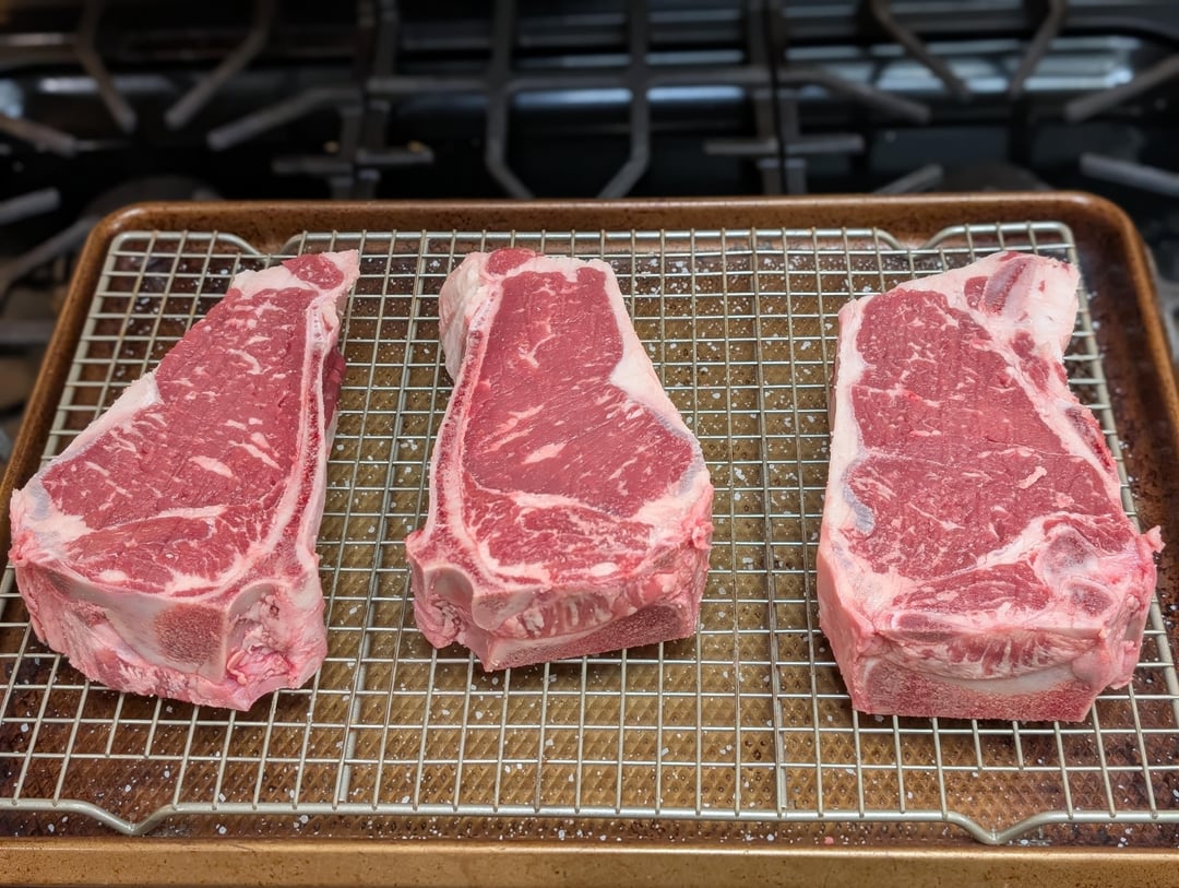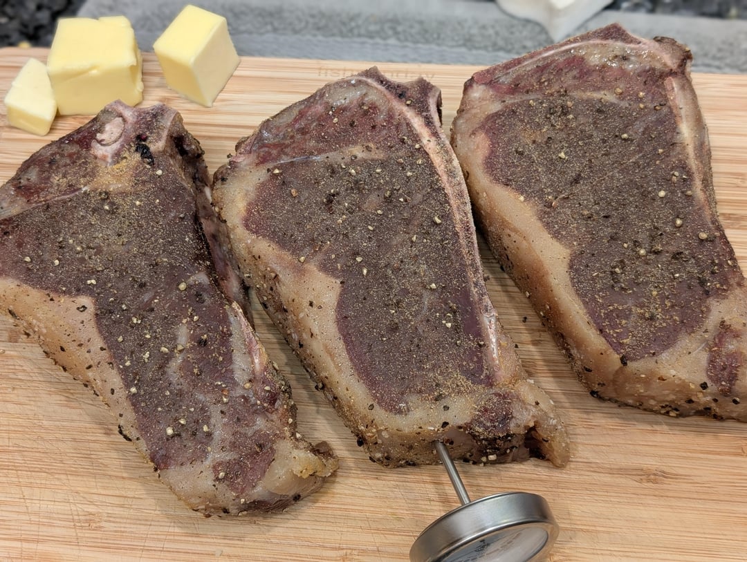 Dry-brined for 24 hrs, garlic powder and fresh ground pepper for seasoning. Reverse-seared at 225°F until 115°F, let it rest for 10 minutes, drop in tallow in cast-iron til smoking, 1 min each side and rendered the fat, let the steaks and pan cool, finish steaks with quick butter basting w/ minced garlic, rosemary, thyme, and parsley.