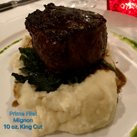 My friends also went with the steak selections; one had the 10 oz. King Cut Prime Filet Mignon, and the other, the 6 oz. Petit. By all accounts, as well as by their clean dishes, their meals were as satisfying and delicious as mine, and there was nothing but high praise all around.