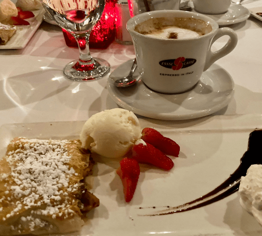 Finishing off we all went with the Apple Fritter dessert, and Cappuccinos. A luscious, flakey, glazed golden outer crust filled with apple stuffing and accompanied with strawberries and cream. Great texture and just the right amount of sweetness. It was extremely gracious of our host, Besi, to offer us a complimentary Port Wine Aperitif to end a culinary exciting, and satisfying evening.