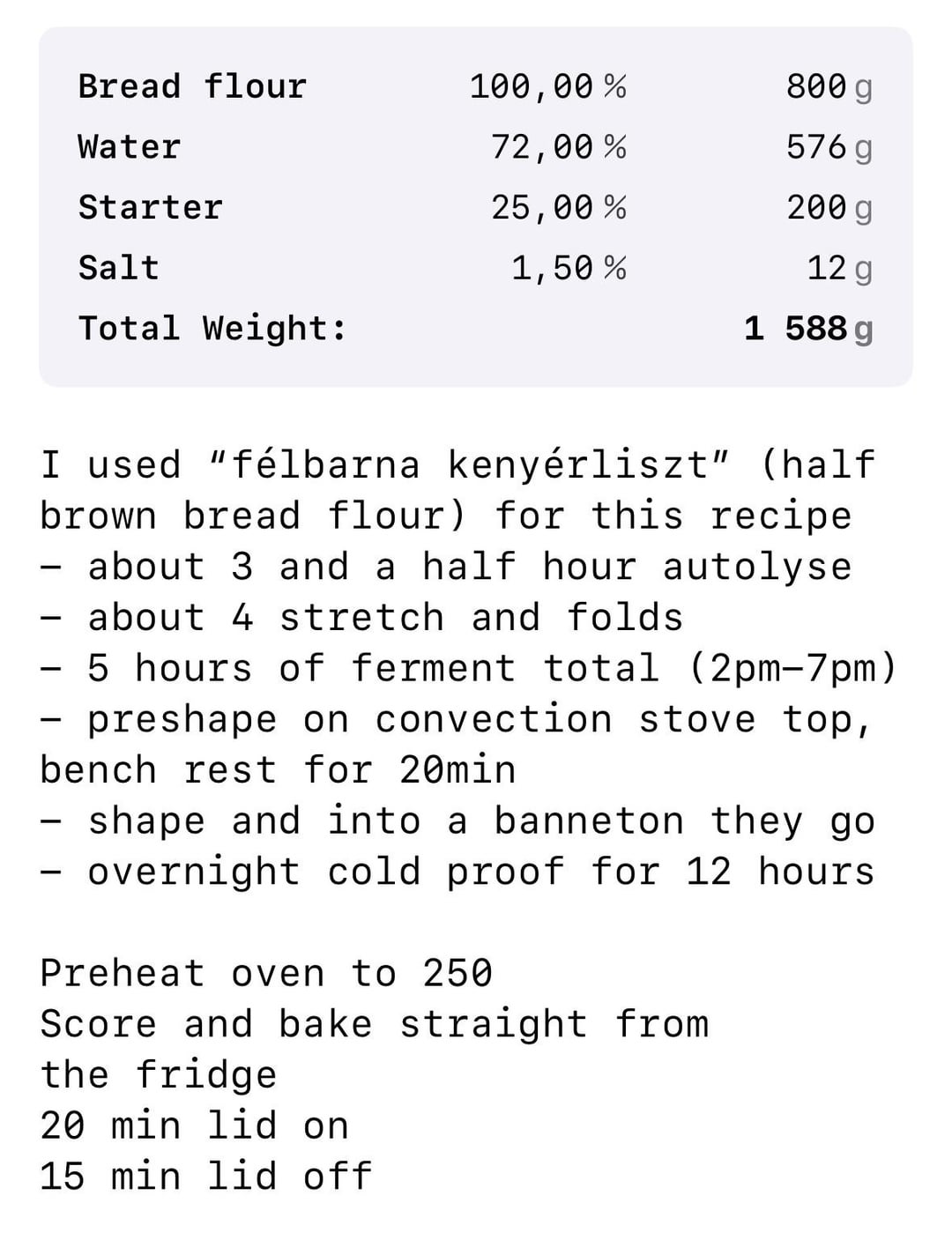 Note: the hydration in the recipe does not take into account the hydration of the starter. Including the starter the total dough hydration is about 80%