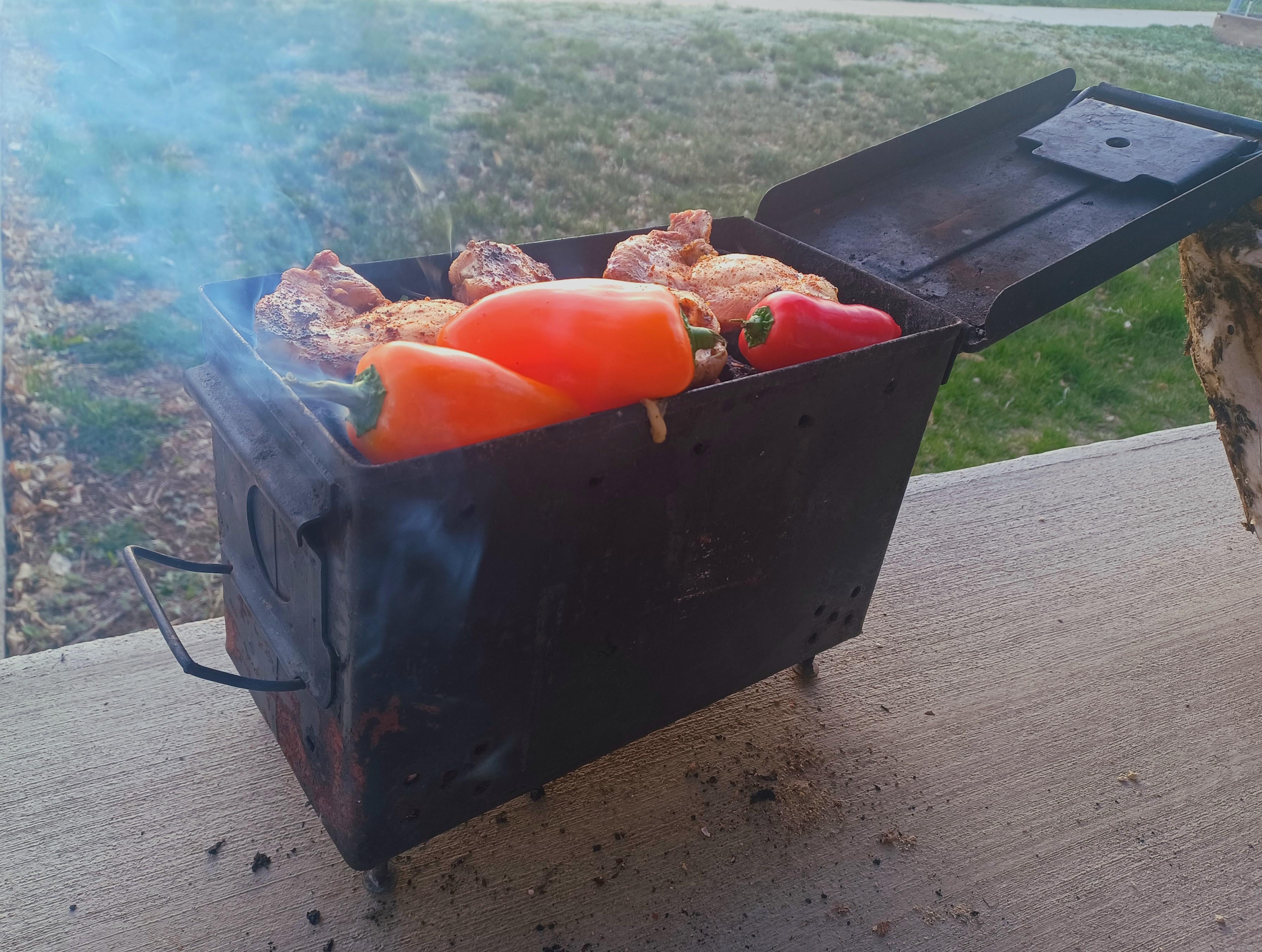 Made this little grill last year to cook steaks at work in the bed of my truck. Stripped the paint, drilled some holes, welded nuts to the bottom for the legs which are carriage bolts. Made spacers to put on the bottom and expanded steel for the coals to sit on. Welds some angle iron on as a shelf for the top rack to sit on. I make a lot of Korean bbq meals on this little thing.