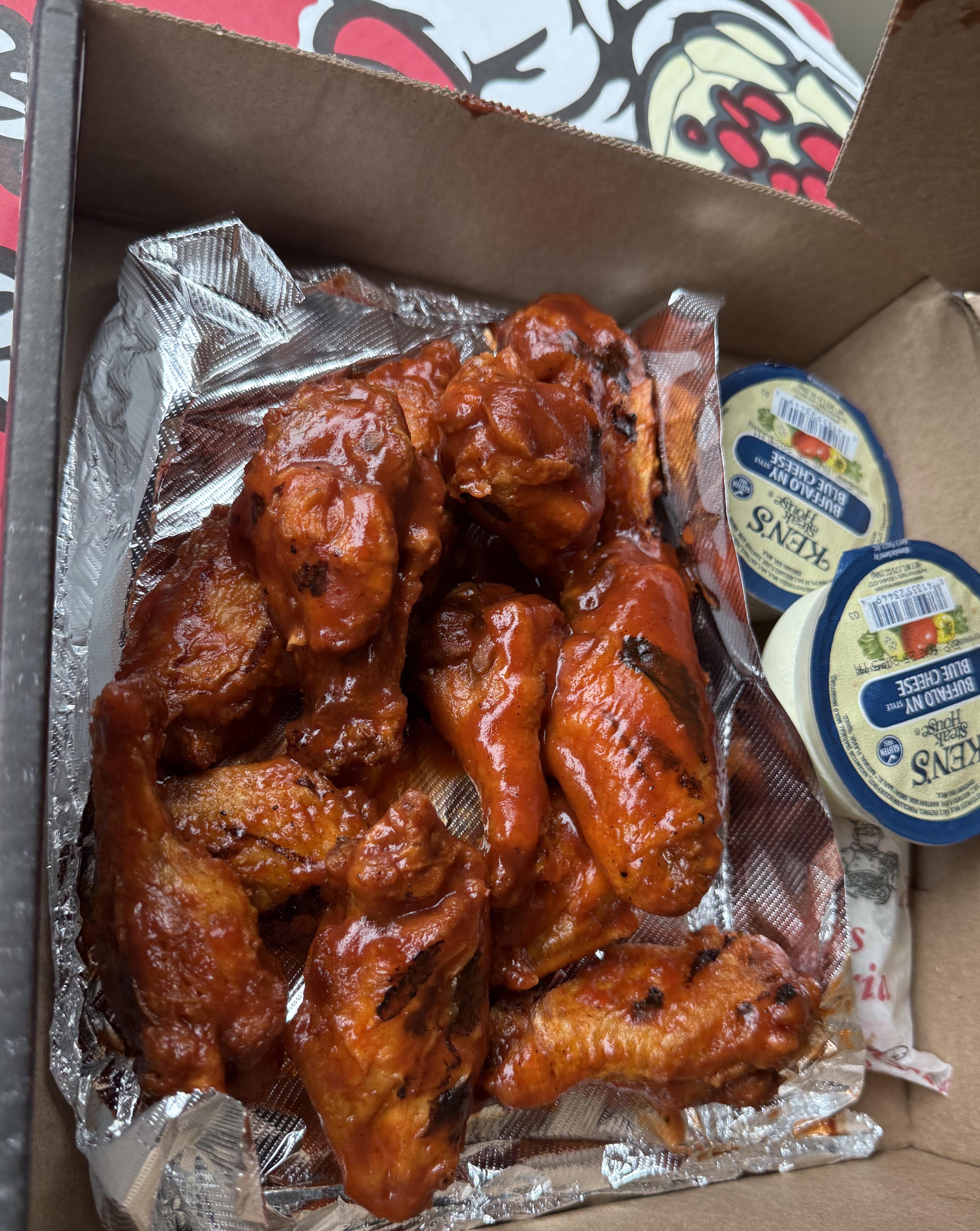 Hot BBQ, very solid flavor and good crisp. 7.5/10 because there’s no homemade bleu, would probably be like 8.1-8.3 if they served a non commercial dip.