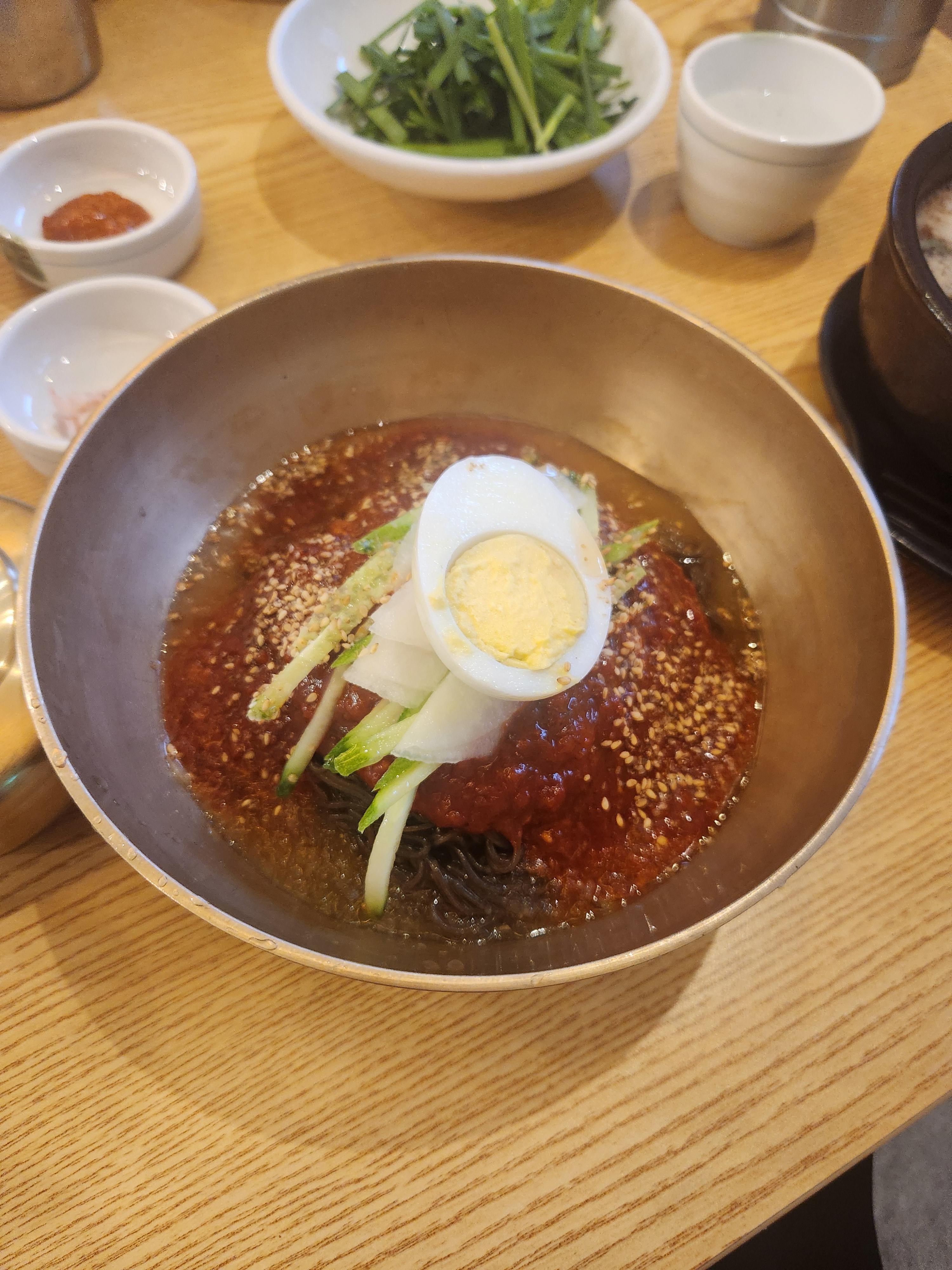 I lean towards the mul naeng. With lots of vinegar, hot mustard (겨자), and seasoned red pepper sauce (다대기).