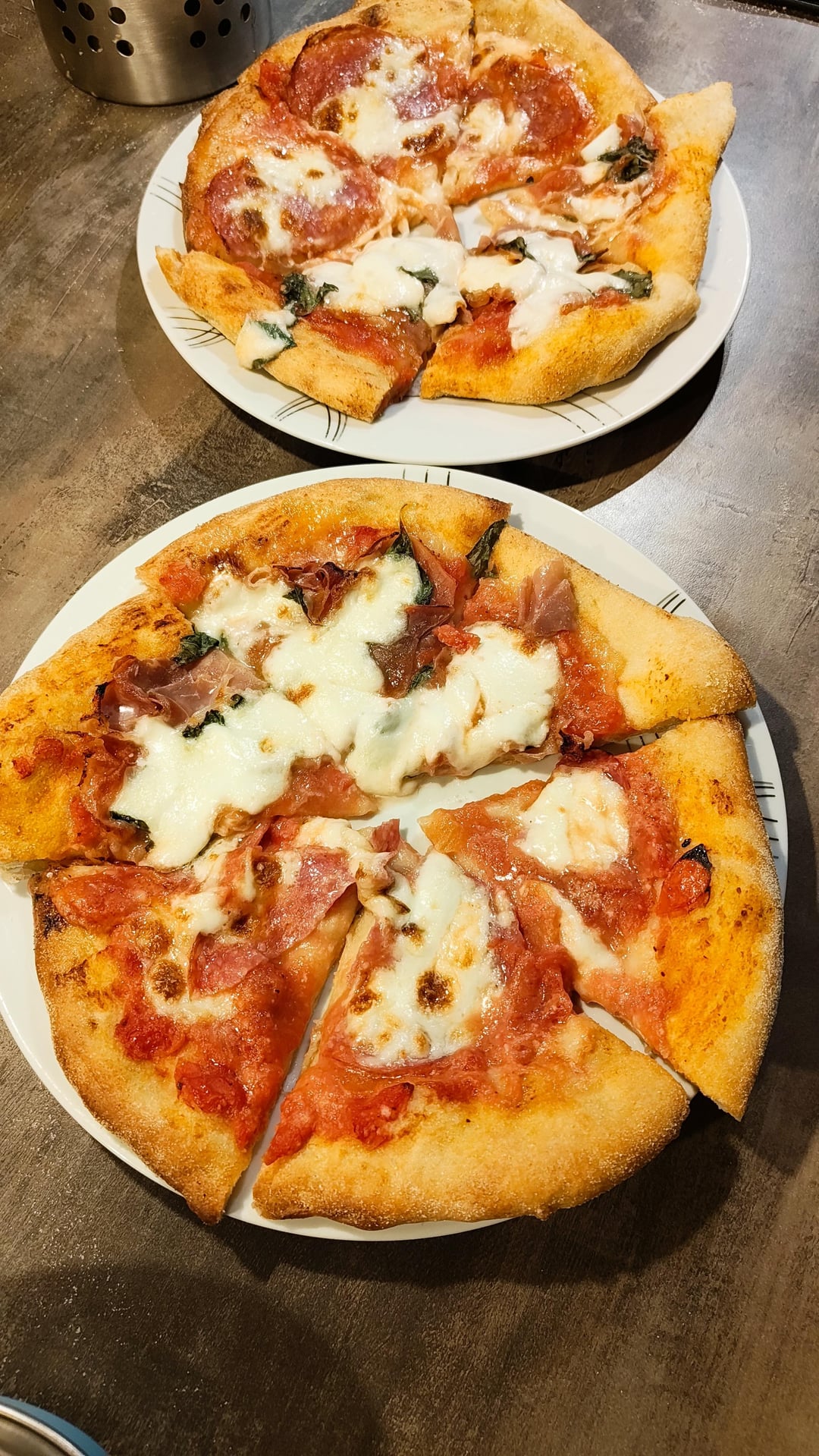 Following the excellent guidance of Vito, this is my 2nd go with a polish dough. May be over proved (had to separate in the dough box) and my oven only goes to 220C but they were frigging tasty, crispy chewy crust and held themselves to eat.