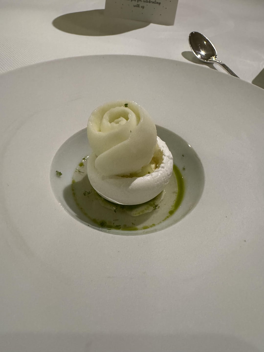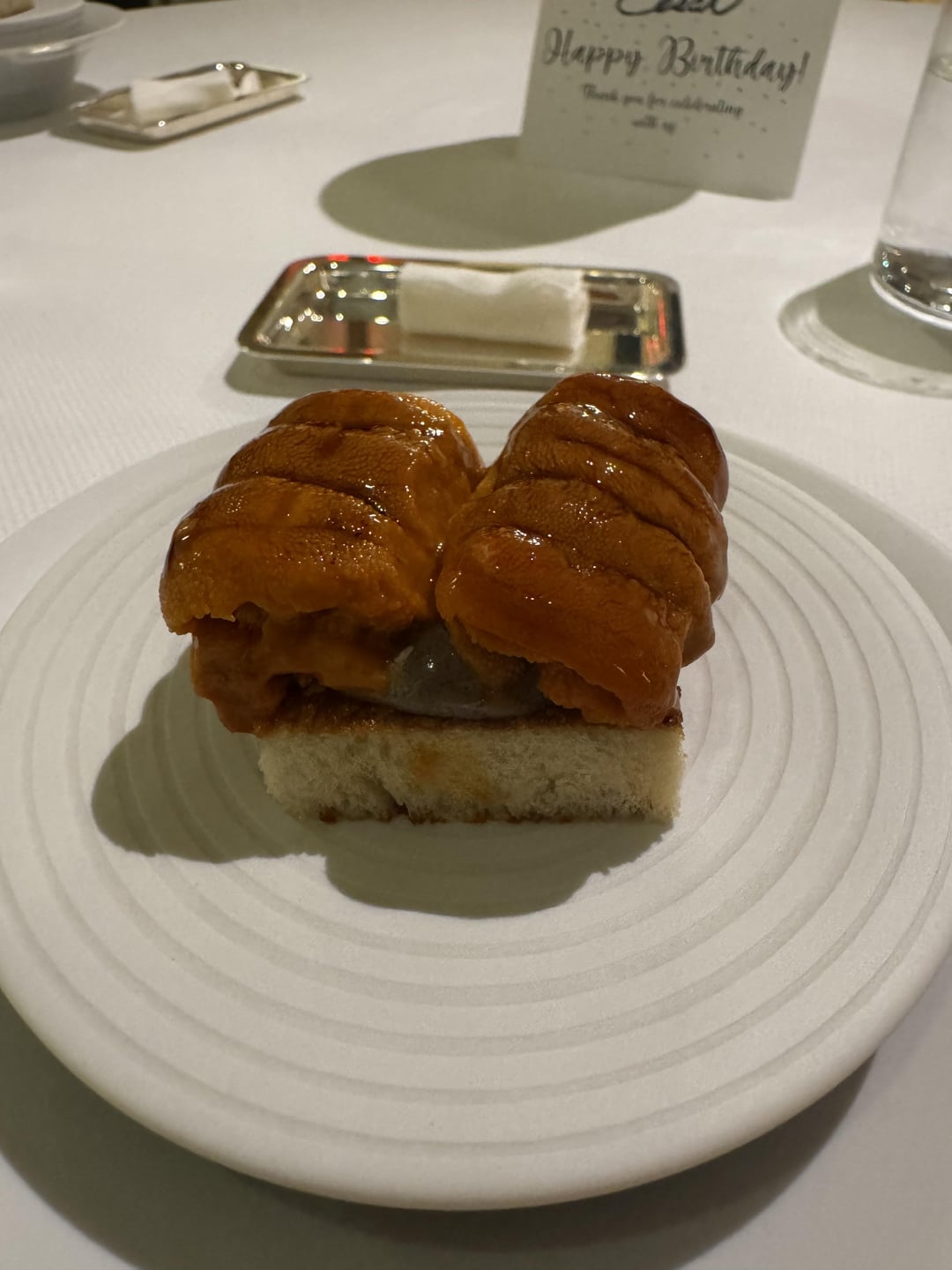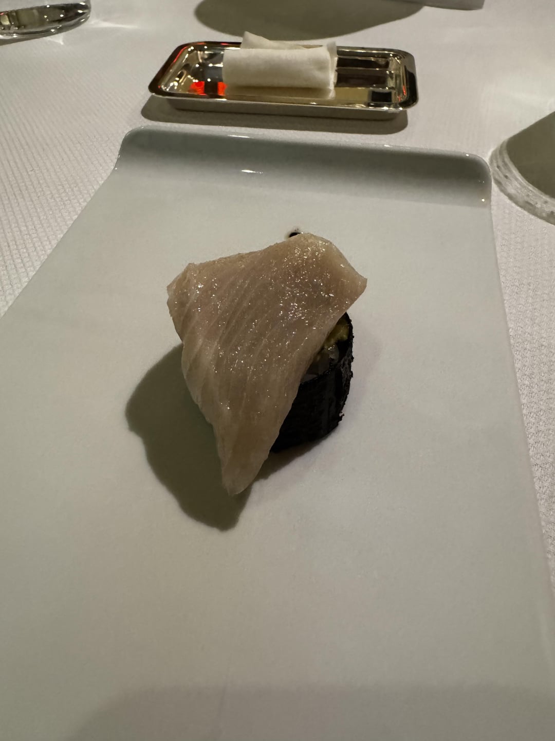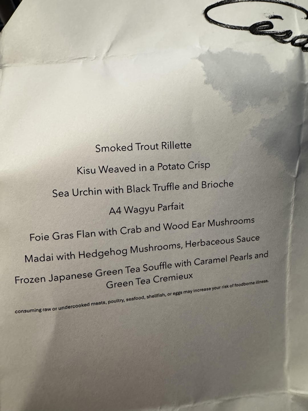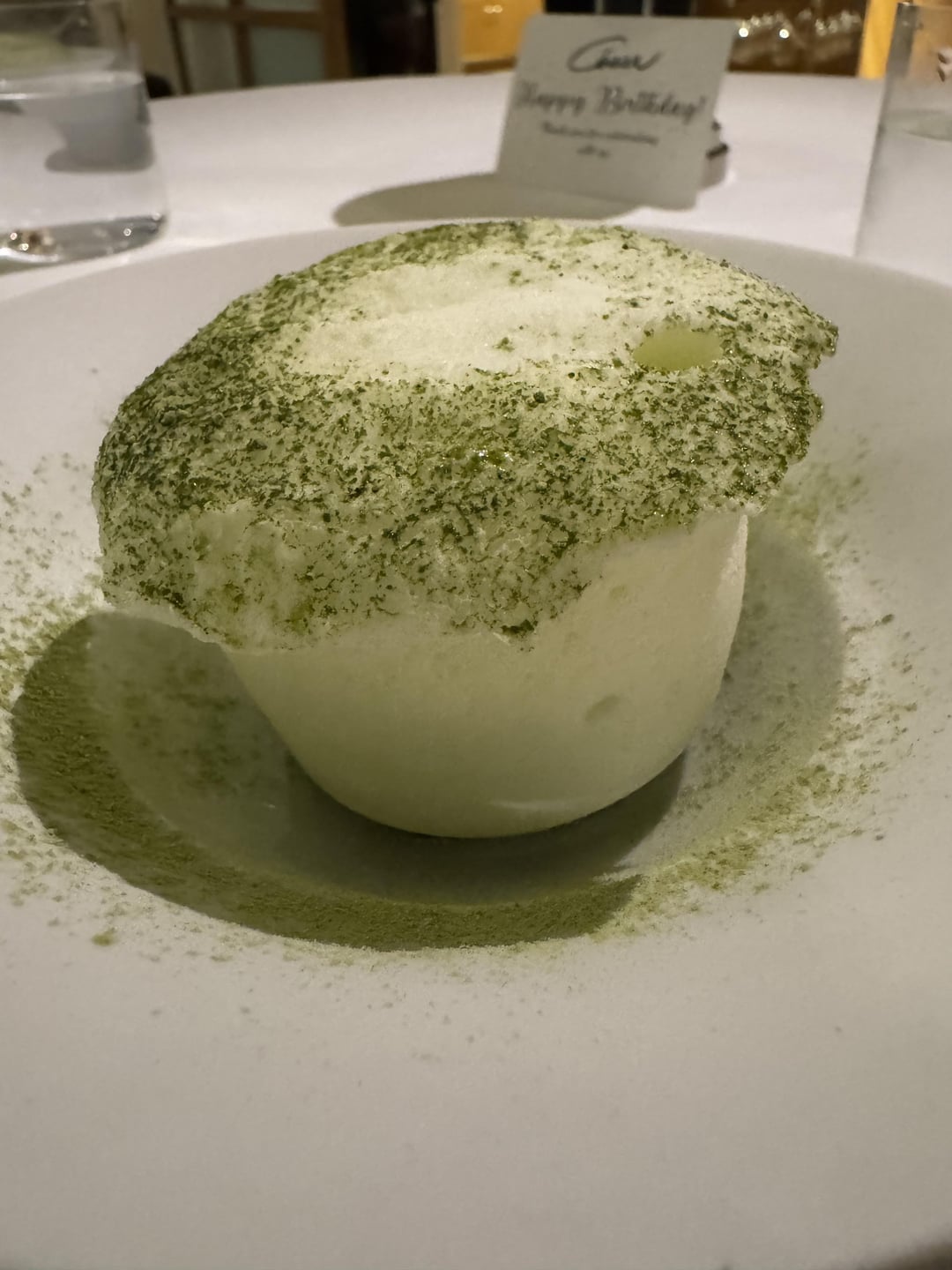 An outstanding meal overall. We are pescetarian so they replaced some things like wagyu with bluefin tuna and foie gras with ravioli. Easily the best Western seafood I’ve ever had, including Le Bernardin. However, I will say after enjoying the seafood we were very underwhelmed by the dessert, which was a matcha shaved ice soufflé with a tiny bit of ice cream under it. It was so light that it barely even registered and not the rich and satisfying dessert we were hoping we would get (it was my birthday too, and nothing extra for that, while Le Bernardin gave us a cupcake).