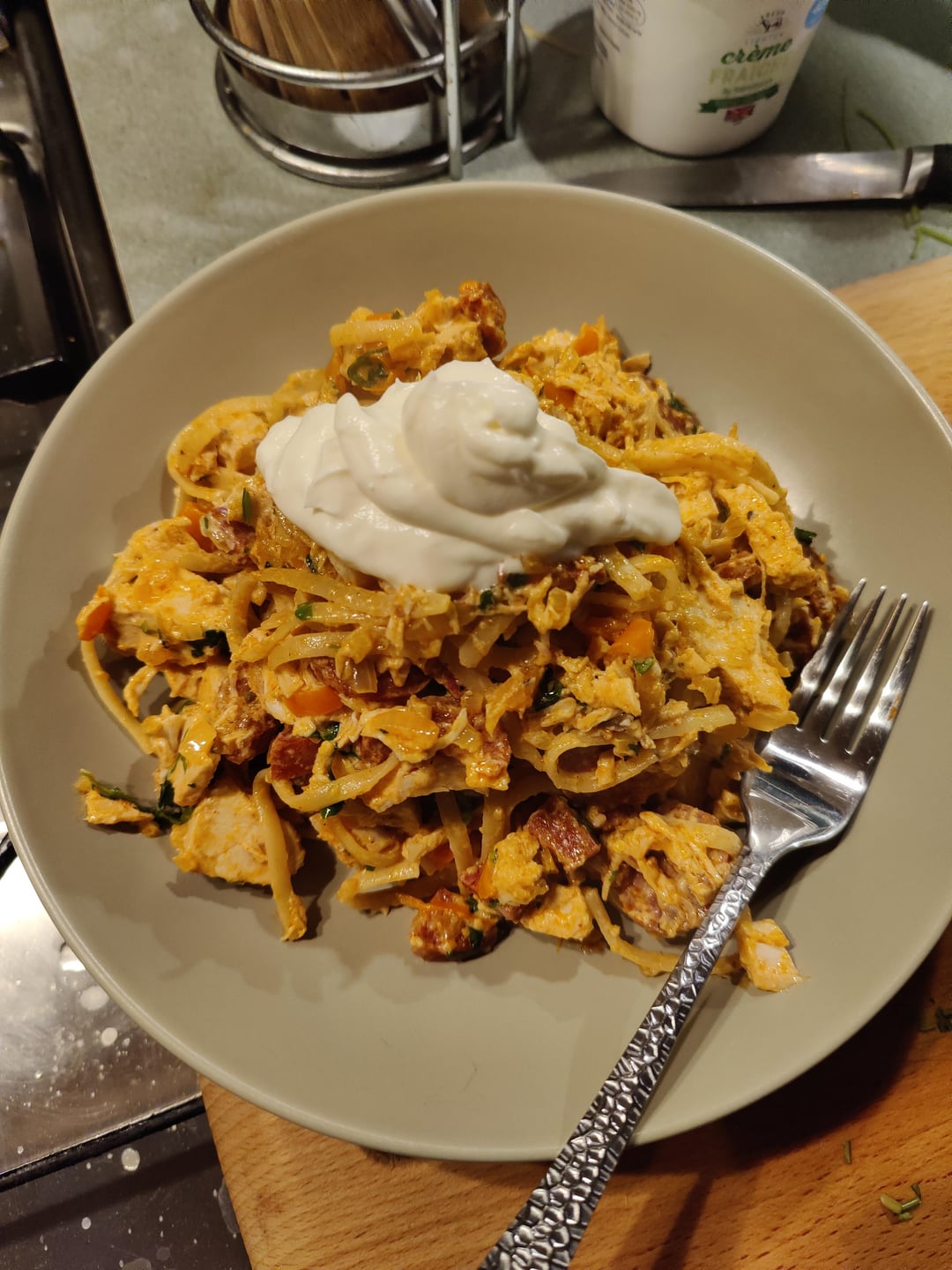 Linguine with leftover roast chicken, diced chorizo, chopped orange pepper, chopped onion, garlic, paprika, parsley, and creme fraiche. (I'd normally use pasta shapes like fusilli, but linguine was all I had.)by tobotic Write A CommentYou must be logged in to post a comment.