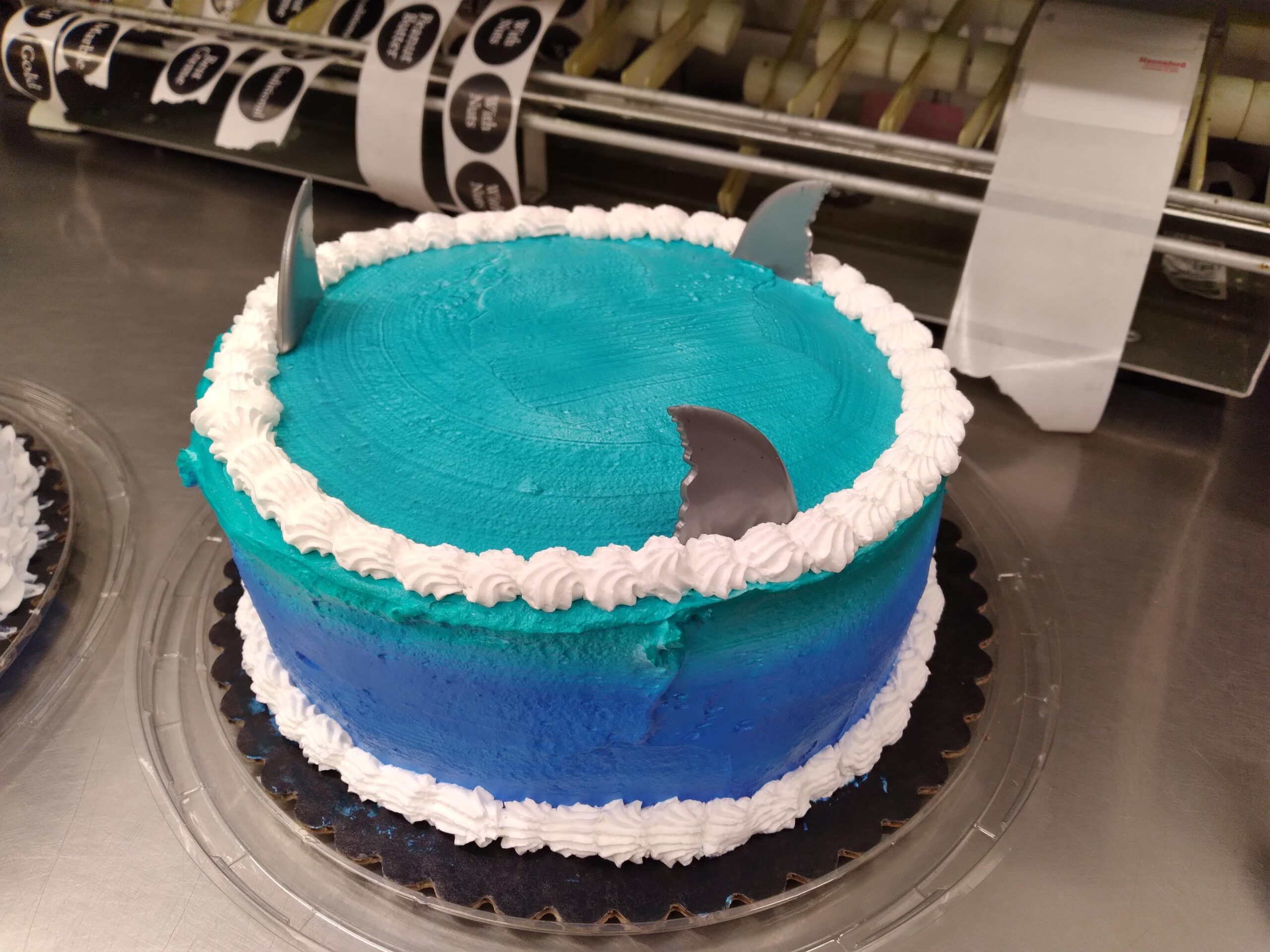 Used to work in a bakery. The cakes were premade, but I had a lot of creative freedom with decorating. This was my first attempt at a shark themed cake with fin decorations. I made a few of these while I worked there. They were always gone the next day, people loved them 😁