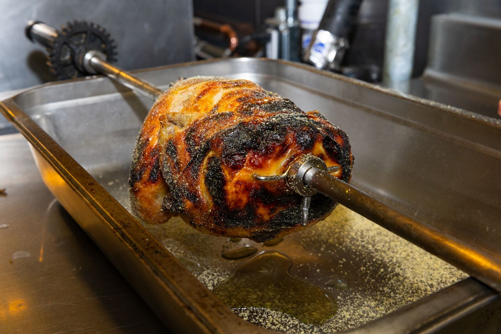 Daytrip Counter’s menu is centered on rotisserie chicken, which is brined in a vinegar-based solution overnight, air dried and slow roasted before going into the broiler to render a golden, crispy skin. Credit: Estefany Gonzalez