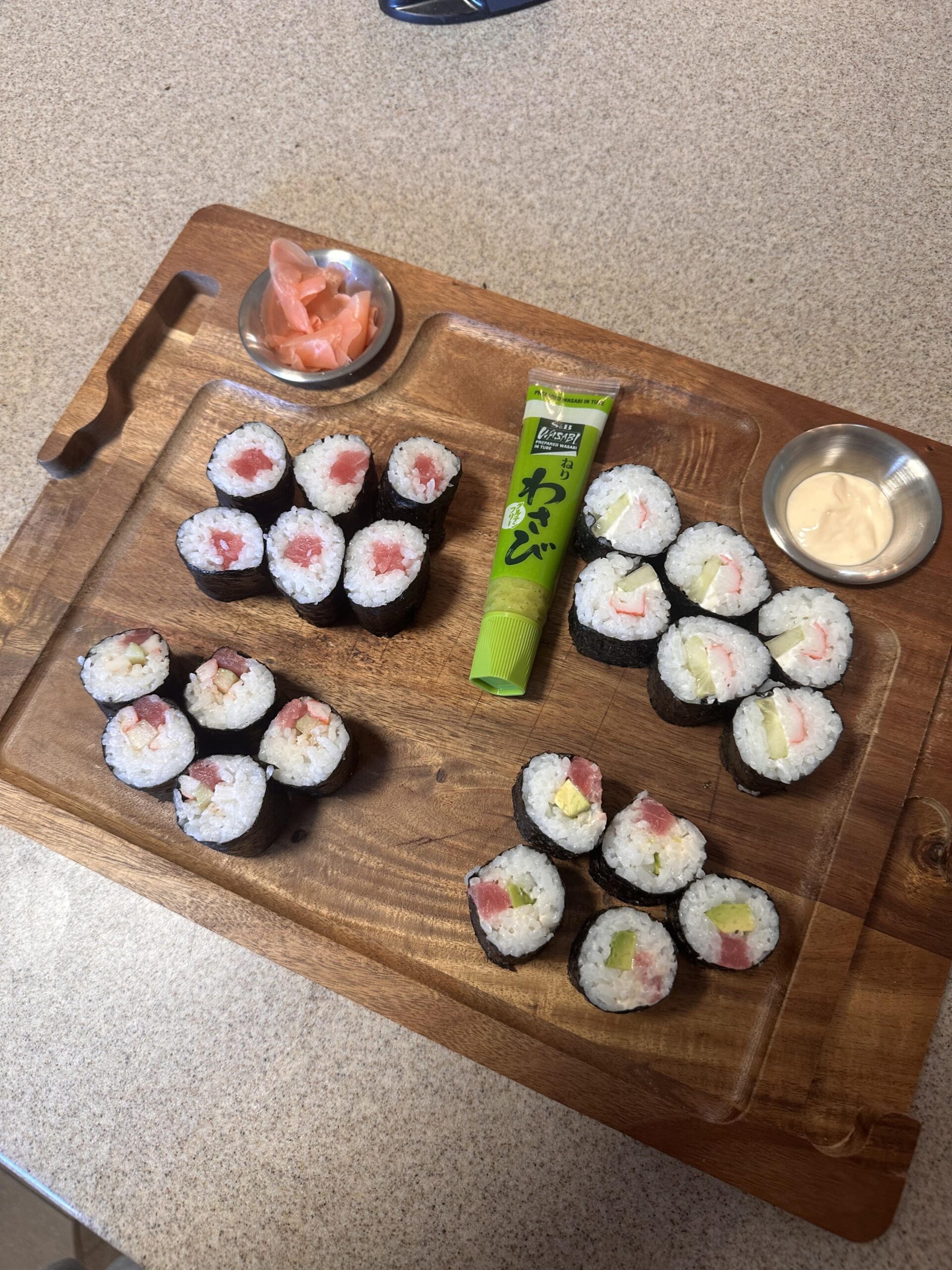 Looks good! You’re getting clean cuts with your knife. As you get more practice, your fillings will end up in the center. Try putting some scallion or green onion with your tuna.