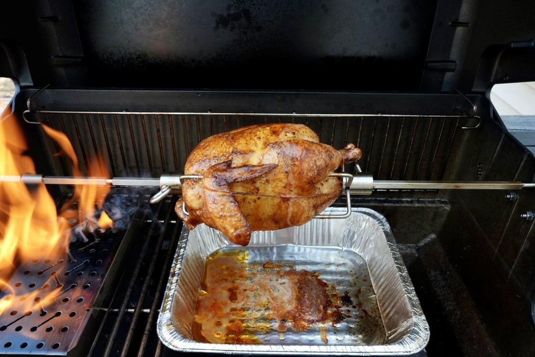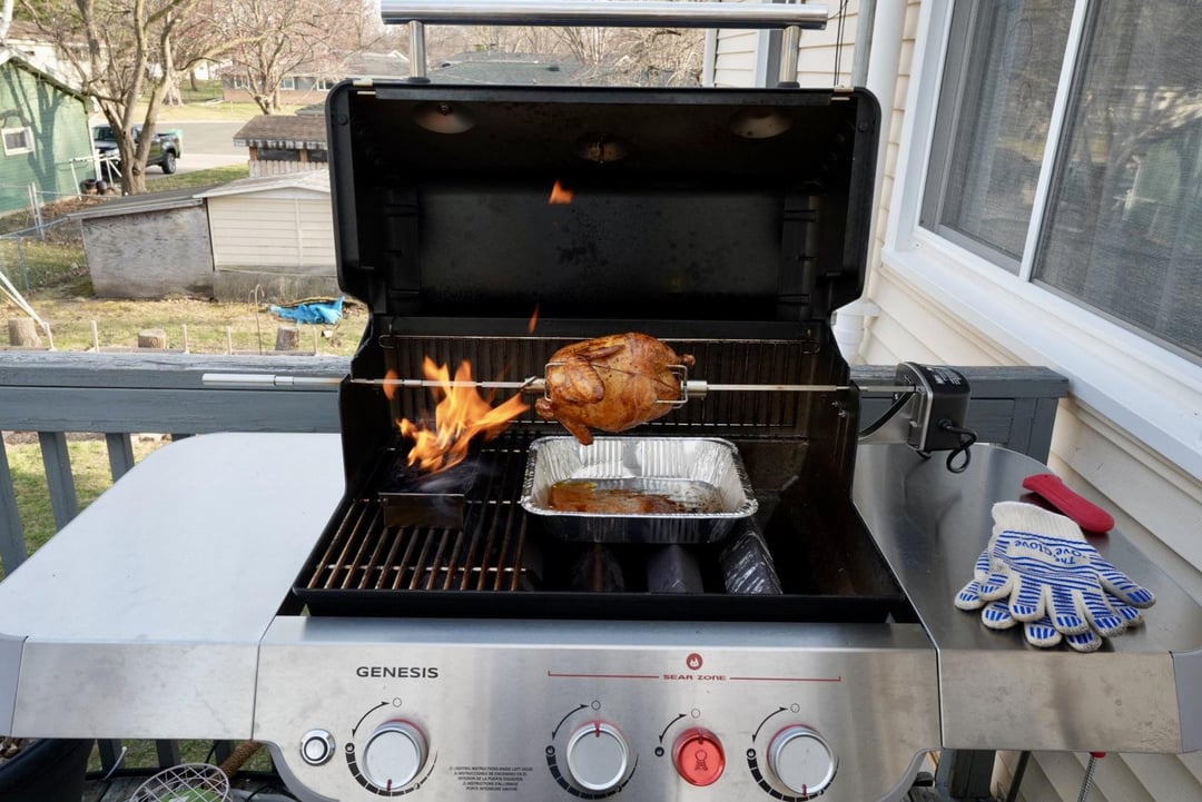 Very impressed with the results of my first time using the Weber rotisserie on my Genesis 325. Full chicken, olive oil, salt, Penzy’s Barbecue of the Americas spice mix, about 2 hrs hovering around 350°.
