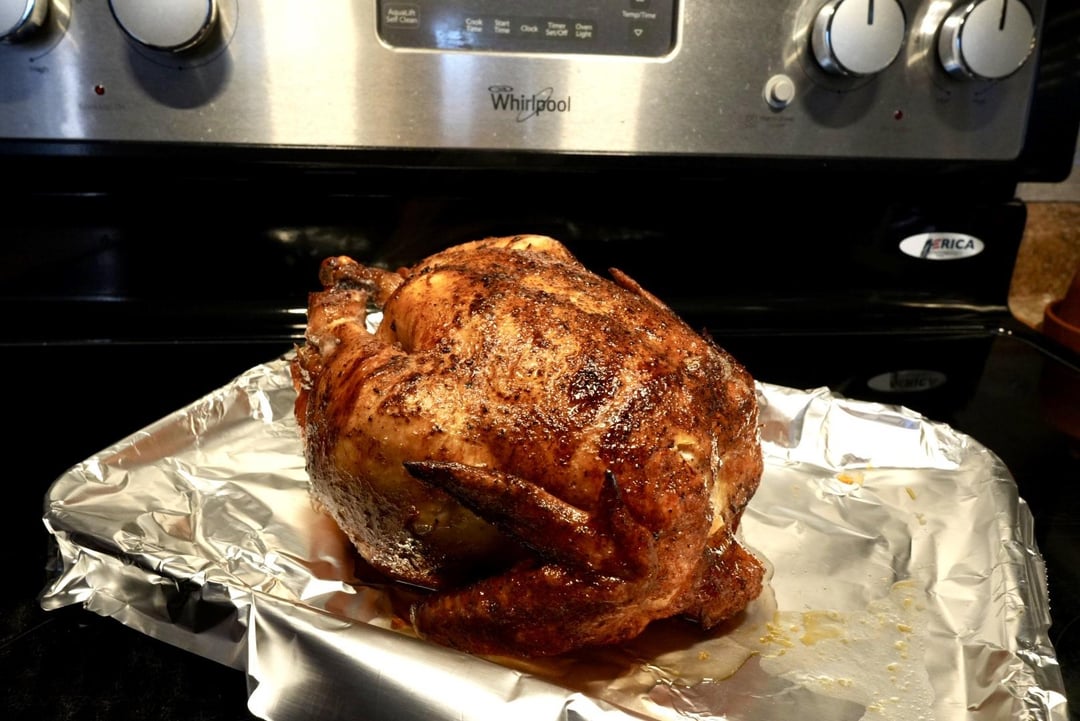 Next time, move bird and pan to right side a bit. Adjust heat to be as indirect as possible, target for Weber is right around 400 degrees. Will take 60 to 90 mins cook a 4.5 to 5lb chicken.