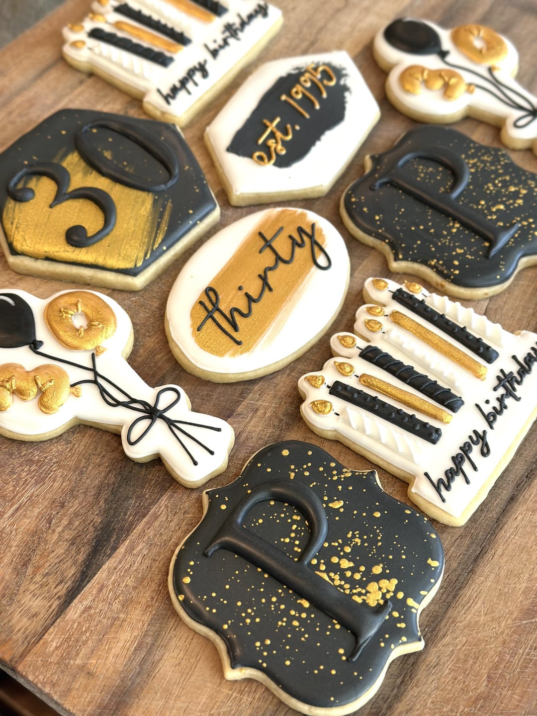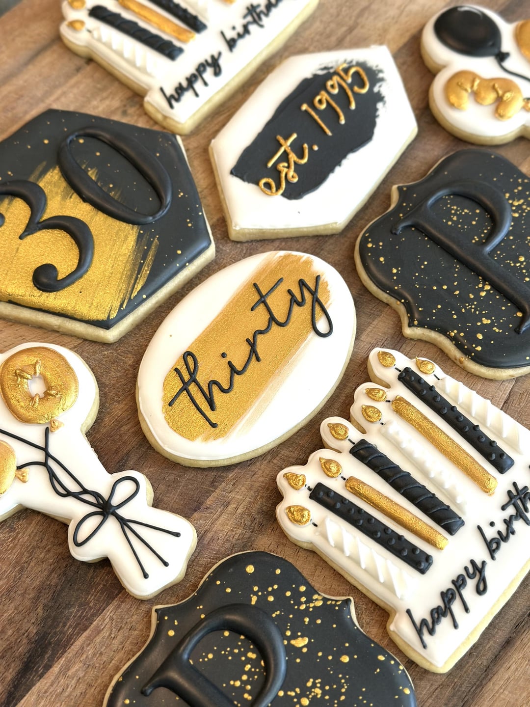 Also wanted to add: doesn’t hurt that this was only two colors 😆 The worst part of cookie decorating is 10000% mixing colors, so I was PUMPED that the client only wanted black, white, and gold accents. Win, win!