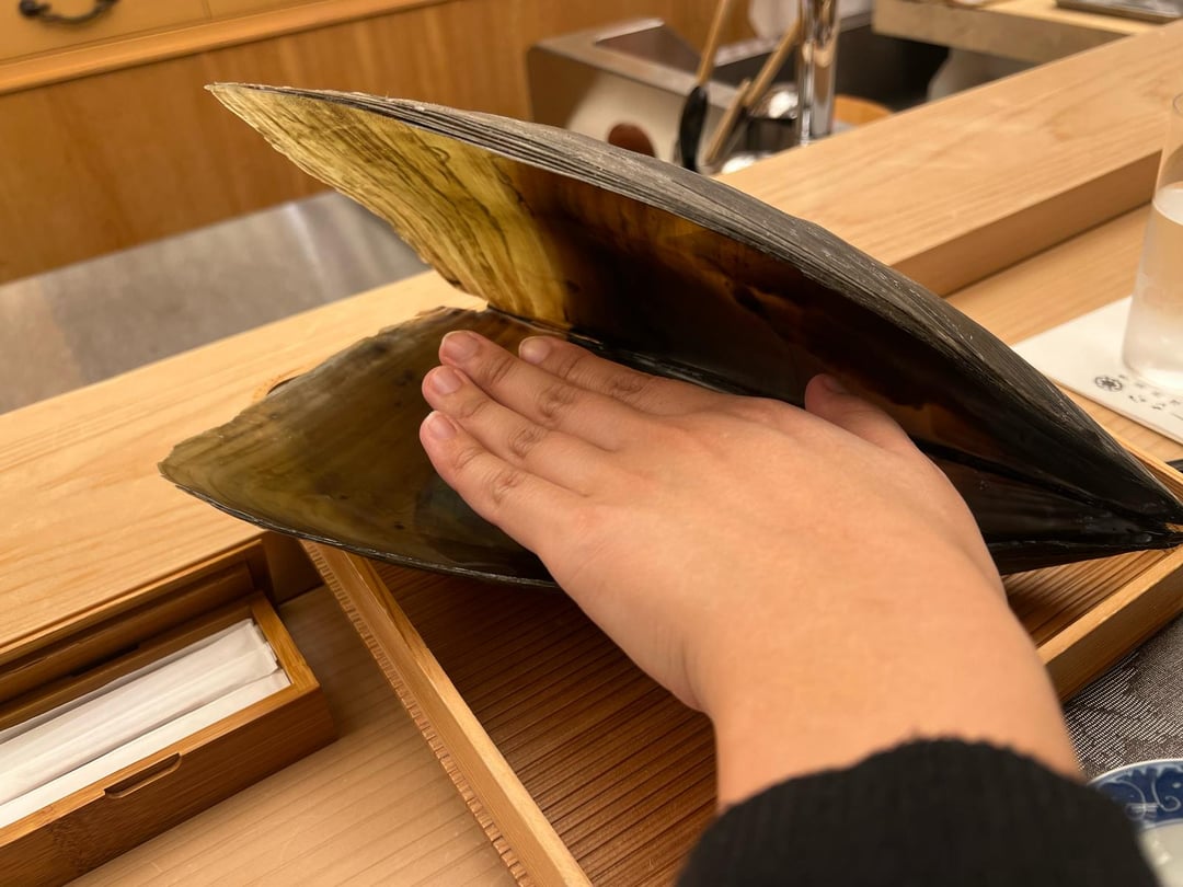 ++tairagai, miso sauce, huge tairagai, 3 thick chunky slices (completely different texture vs at a sushiya sliced thinly & horizontally), firm, meaty, plump, fantastic.