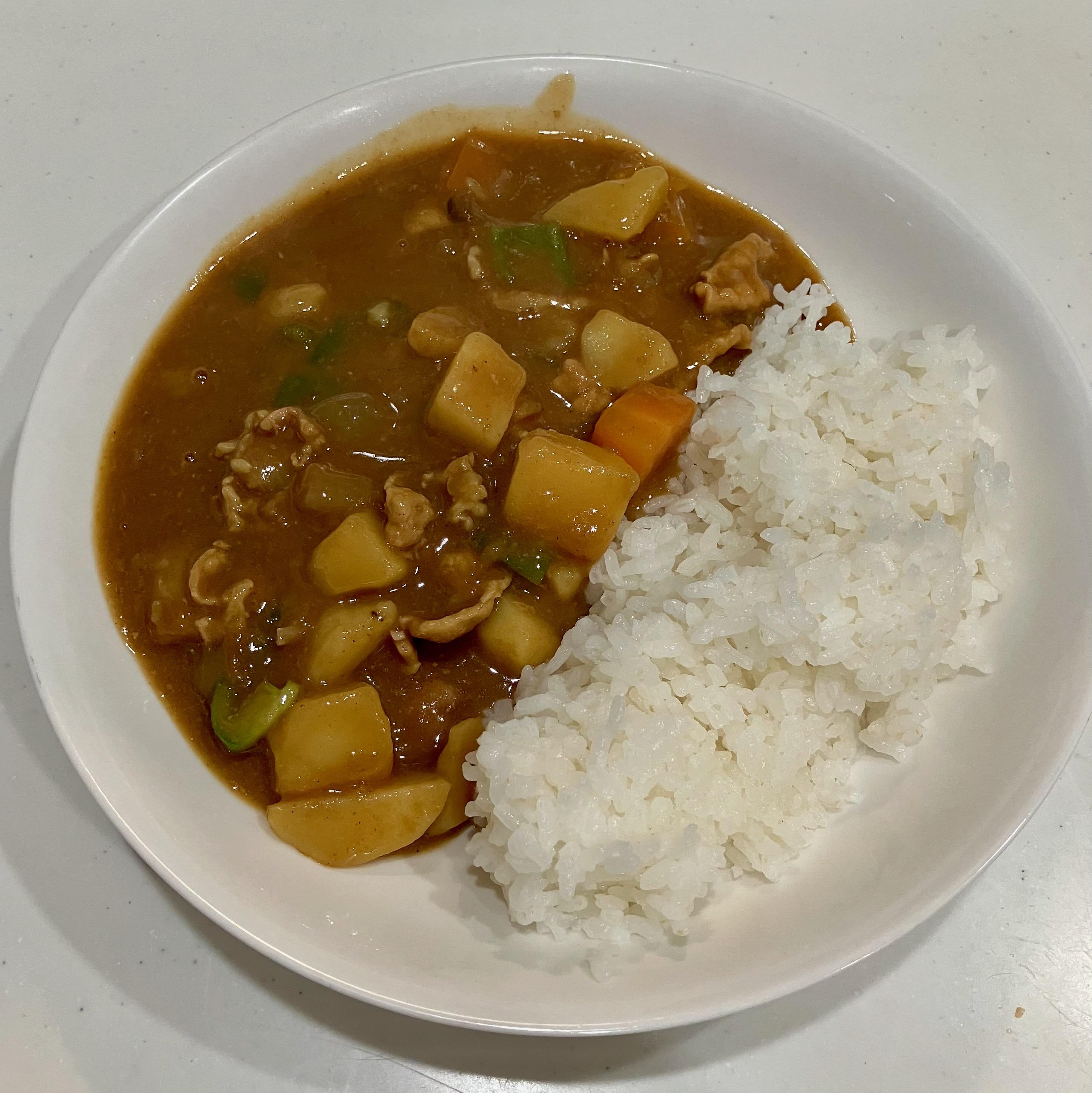 We have curry a couple times a month because it's easy on sports practice day for my son. Make it at about 3pm, cover and head to practice then eat afterwards. Pretty standard home curry using Vermont roux cubes with pork, onion, potato, carrot and piman.