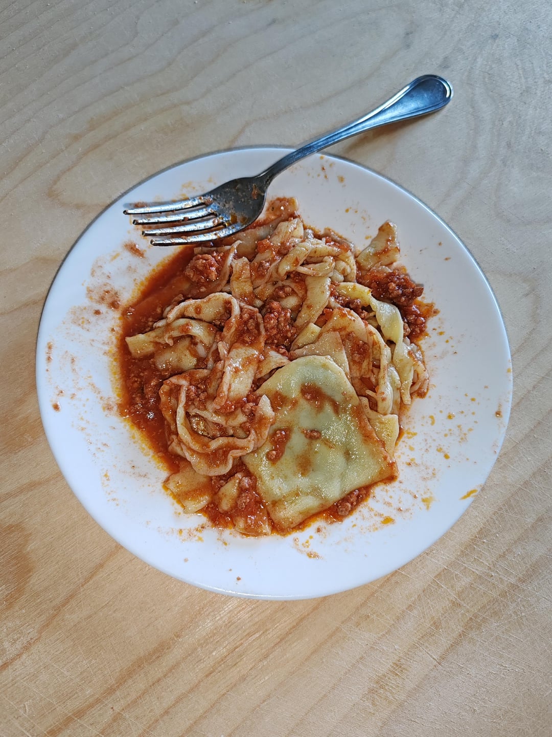 It's been so long since I've last made ravioli (in Romagna lots of people call them tortelli, but I Changed the title since it could be misleading), since last August I think. I always used to make them with my grandma, so this is my first time trying solo. it was a lot of work (I made more than 2 kg of pasta), but it's so rewarding. the filling came out flavourful just right and the dough was really nice (I made 12 eggs worth of dough so I've still got some left to do something else, hence the nastrini in the 5th picture). my grandpa laughed everytime he looked at me cause I had a loooot of work to do, but he helps out in other ways so he's fine. obviously, after I had finished everything, I had to cook the mandatory afternoon snack to restore my energy, so it's got both me and my mom's approval. she also said I'm slowly becoming an azdora, and being 20 I take that as the highest compliment ever.